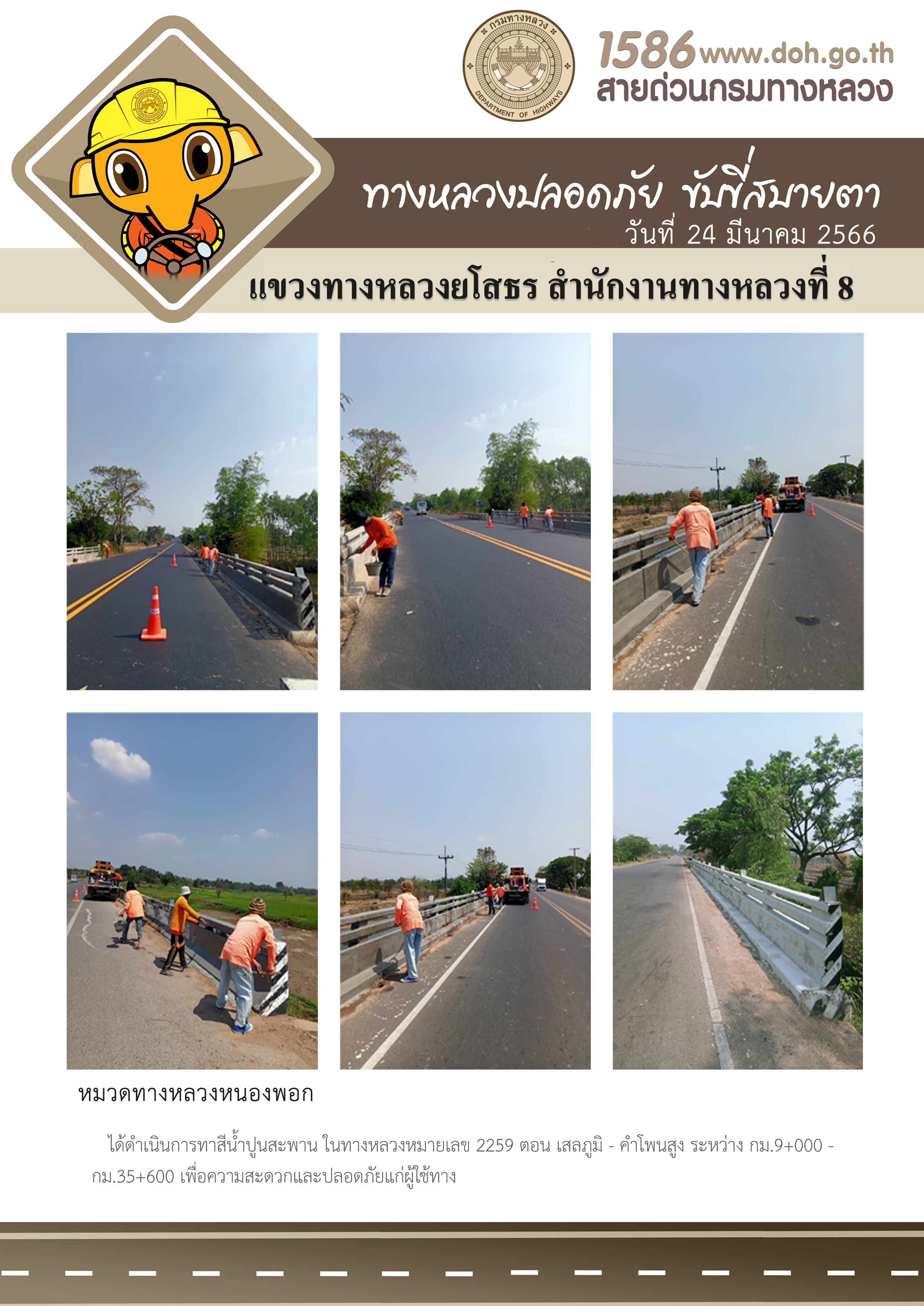 วันที่ 24 มีนาคม 2566 หมวดทางหลวงหนองพอก ได้ดำเนินการทาสีน้ำปูนสะพาน ในทางหลวงหมายเลข 2259 ตอน เสลภูมิ - คำโพนสูง ระหว่าง กม.9+000 - กม.35+600 เพื่อความสะดวกและปลอดภัยแก่ผู้ใช้ทาง