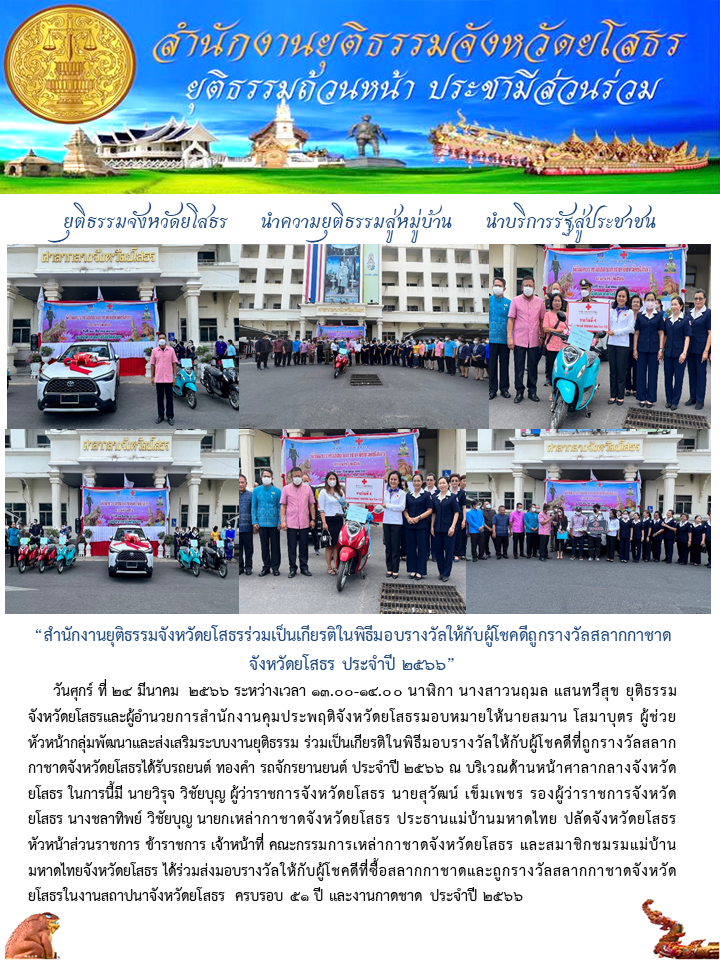สำนักงานยุติธรรมจังหวัดยโสธรร่วมเป็นเกียรติในพิธีมอบรางวัลให้กับผู้โชคดีถูกรางวัลสลากกาชาดจังหวัดยโสธร ประจำปี 2566