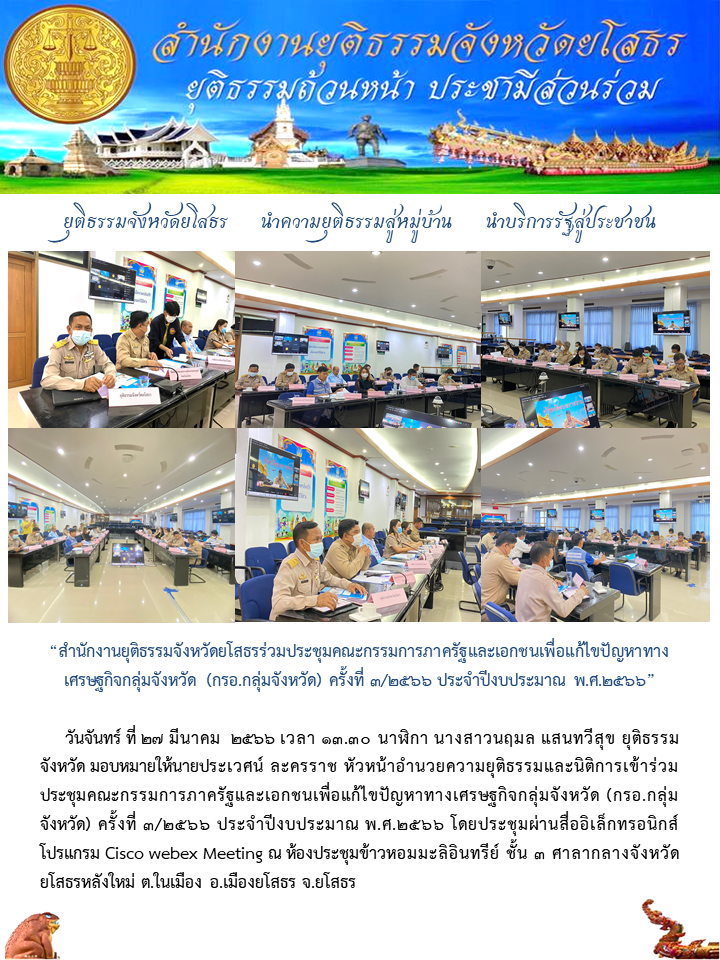 สำนักงานยุติธรรมจังหวัดยโสธรร่วมประชุมคณะกรรมการภาครัฐและเอกชนเพื่อแก้ไขปัญหาทางเศรษฐกิจกลุ่มจังหวัด (กรอ.กลุ่มจังหวัด) ครั้งที่ 3/2566 ประจำปีงบประมาณ พ.ศ.2566