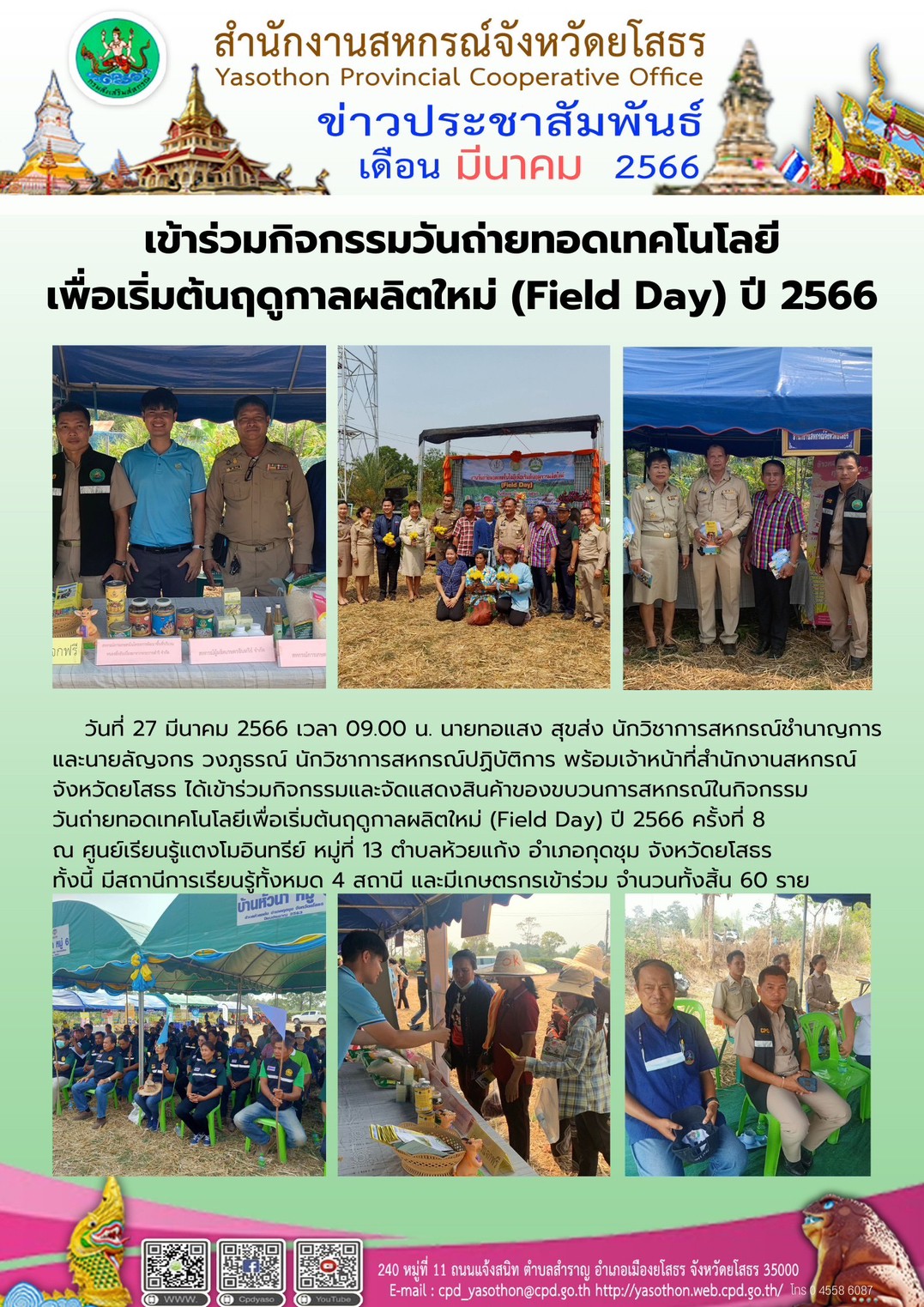 เจ้าหน้าที่สำนักงานสหกรณ์จังหวัดยโสธร ร่วมกิจกรรมและจัดแสดงบสินค้าของขบวนการสหกรณ์ในกิจกรรมวันถ่ายทอดเทคโนโลยีเพื่อเริ่มต้นฤดูกาลผลิตใหม่ (Field Day) ณ ศูนย์เรียนรู้แตงโมอินทรีย์ ตำบลห้วยแก้ง