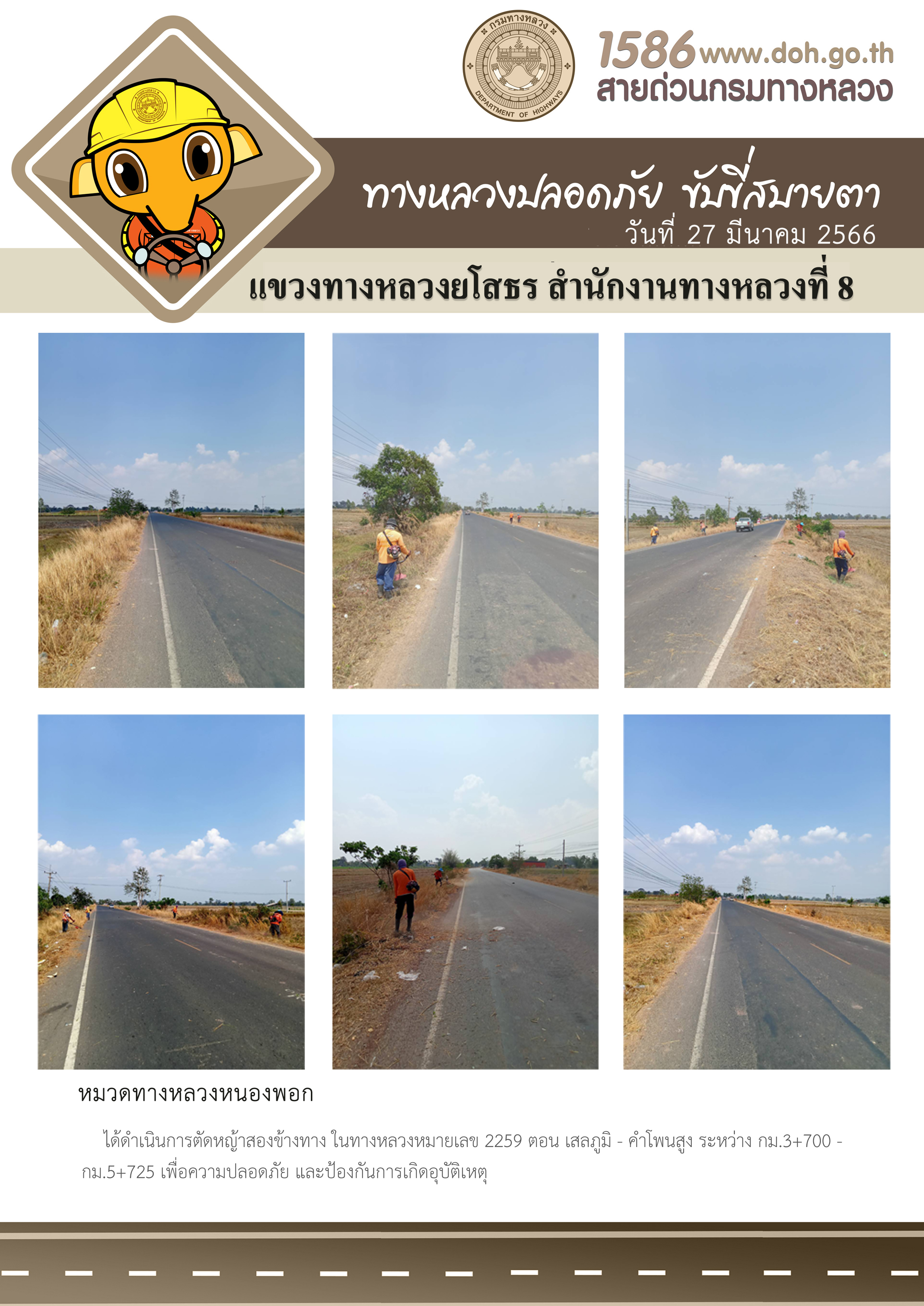 วันที่ 27 มีนาคม 2566 หมวดทางหลวงหนองพอก ได้ดำเนินการตัดหญ้าสองข้างทาง ในทางหลวงหมายเลข 2259 ตอน เสลภูมิ - คำโพนสูง ระหว่าง กม.3+700 - กม.5+725 เพื่อความปลอดภัย และป้องกันการเกิดอุบัติเหตุ