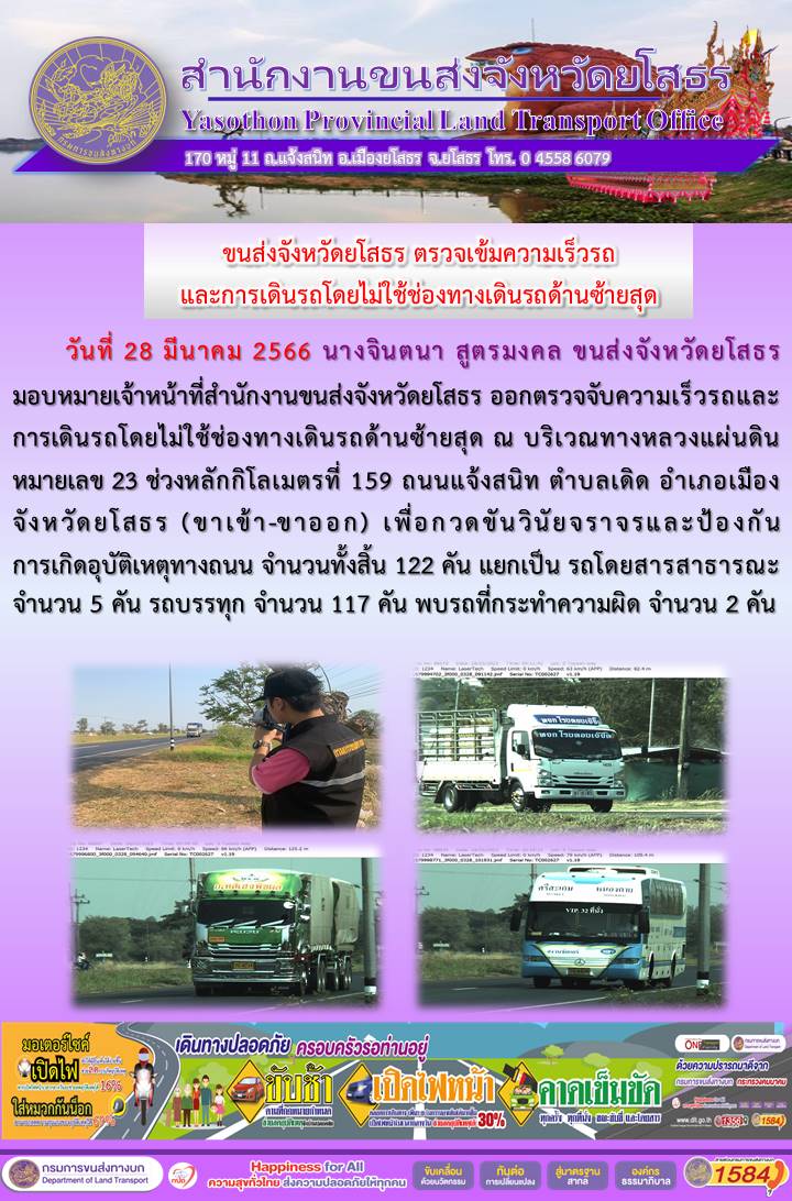 วันที่ 28 มีนาคม 2566 เจ้าหน้าที่สำนักงานขนส่งจังหวัดยโสธร ออกตั้งจุดตรวจจับความเร็ว