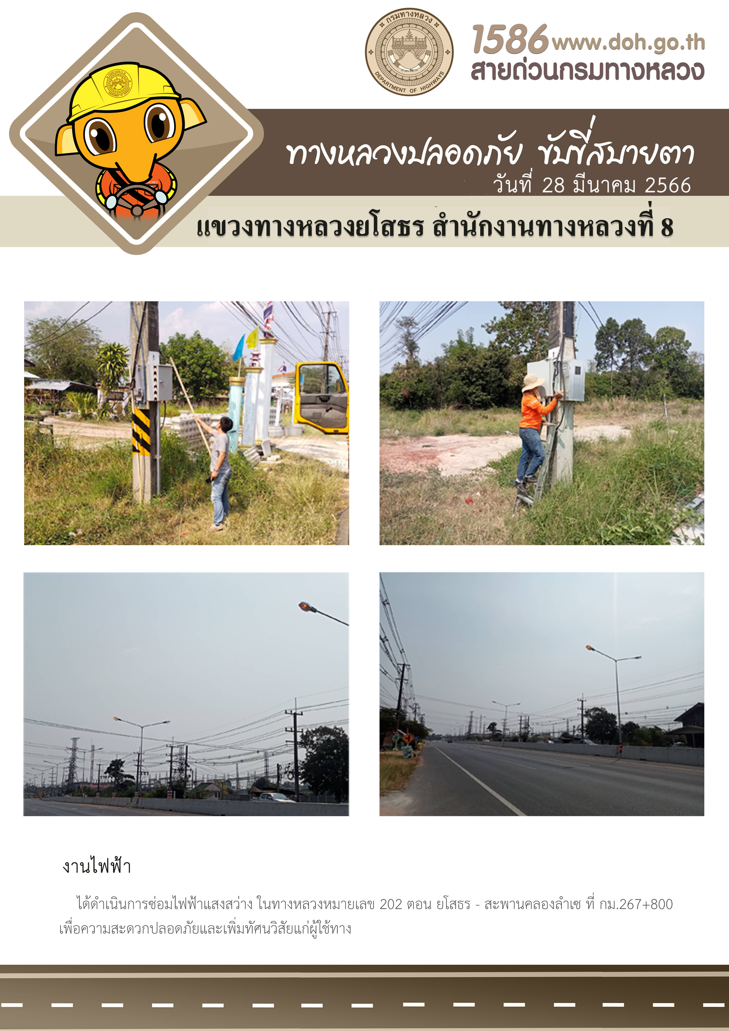 วันที่ 28 มีนาคม 2566 งานไฟฟ้า ได้ดำเนินการซ่อมไฟฟ้าแสงสว่าง ในทางหลวงหมายเลข 202 ตอน ยโสธร - สะพานคลองลำเซ ที่ กม.267+800 เพื่อความสะดวกปลอดภัยและเพิ่มทัศนวิสัยแก่ผู้ใช้ทาง