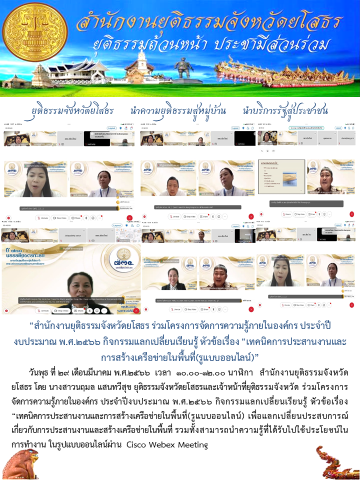 วันที่ 30 มี.ค. 2566 (13:48 น.)วันพุธ ที่ 29 เดือนมีนาคม พ.ศ.2566 เวลา 10.00-12.00 นาฬิกา สำนักงานยุติธรรมจังหวัดยโสธร โดย นางสาวนฤมล แสนทวีสุข ยุติธรรมจังหวัดยโสธรและเจ้าหน้าที่ยุติธรรมจังหวัด ร่วมโครงการจัดการความรู้ภายในองค์กร ประจำปีงบประมาณ พ.ศ.2566 กิจกรรมแลกเปลี่ยนเรียนรู้ หัวข้อเรื่อง “เทคนิคการประสานงานและการสร้างเครือข่ายในพื้นที่(รูแบบออนไลน์) เพื่อแลกเปลี่ยนประสบการณ์เกี่ยวกับการประสานงานและสร้างเครือข่ายในพื้นที่ รวมทั้งสามารถนำความรู้ที่ได้รับไปใช้ประโยชน์ในการทำงาน ในรูปแบบออนไลน์ผ่าน Cisco Webex Meeting
