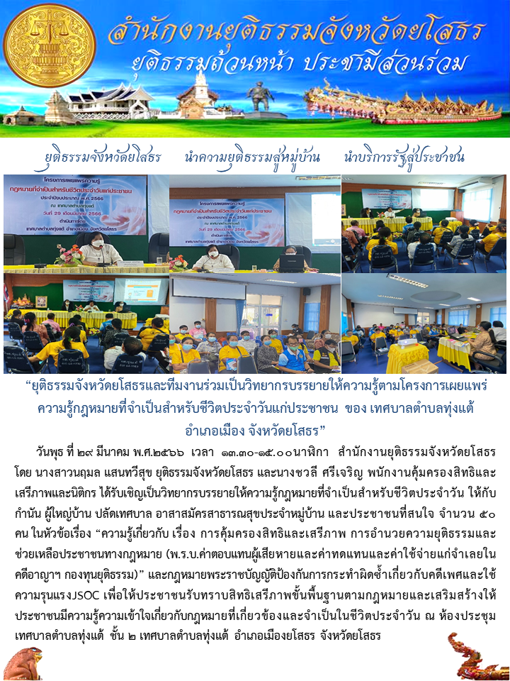 วันที่ 30 มี.ค. 2566 (13:52 น.)วันพุธ ที่ 29 มีนาคม พ.ศ.2566 เวลา 13.30-15.00นาฬิกา สำนักงานยุติธรรมจังหวัดยโสธร โดย นางสาวนฤมล แสนทวีสุข ยุติธรรมจังหวัดยโสธร และนางชวลี ศรีเจริญ พนักงานคุ้มครองสิทธิและเสรีภาพและนิติกร ได้รับเชิญเป็นวิทยากรบรรยายให้ความรู้กฎหมายที่จำเป็นสำหรับชีวิตประจำวัน ให้กับกำนัน ผู้ใหญ่บ้าน ปลัดเทศบาล อาสาสมัครสาธารณสุขประจำหมู่บ้าน และประชาชนที่สนใจ จำนวน 50 คน ในหัวข้อเรื่อง “ความรู้เกี่ยวกับ เรื่อง การคุ้มครองสิทธิและเสรีภาพ การอำนวยความยุติธรรมและช่วยเหลือประชาชนทางกฎหมาย (พ.ร.บ.ค่าตอบแทนผู้เสียหายและค่าทดแทนและค่าใช้จ่ายแก่จำเลยในคดีอาญาฯ กองทุนยุติธรรม)” และกฎหมายพระราชบัญญัติป้องกันการกระทำผิดซ้ำเกี่ยวกับคดีเพศและใช้ความรุนแรงJSOC เพื่อให้ประชาชนรับทราบสิทธิเสรีภาพขั้นพื้นฐานตามกฎหมายและเสริมสร้างให้ประชาชนมีความรู้ความเข้าใจเกี่ยวกับกฎหมายที่เกี่ยวข้องและจำเป็นในชีวิตประจำวัน ณ ห้องประชุมเทศบาลตำบลทุ่งแต้ ชั้น 2 เทศบาลตำบลทุ่งแต้ อำเภอเมืองยโสธร จังหวัดยโสธร