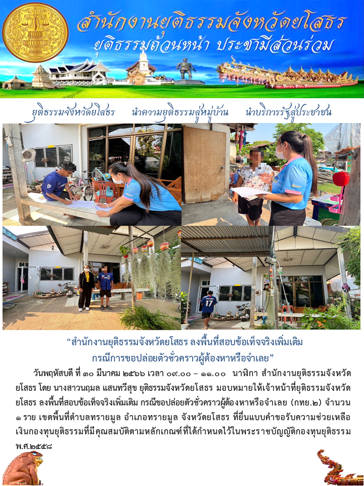 30 มีนาคม 2566 สำนักงานยุติธรรมจังหวัดยโสธร ลงพื้นที่สอบข้อเท็จจริงเพิ่มเติม กรณีการขอปล่อยตัวชั่วคราวผู้ต้องหาหรือจำเลย