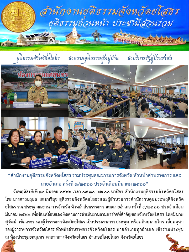 สำนักงานยุติธรรมจังหวัดยโสธร ร่วมประชุมคณะกรมการจังหวัด หัวหน้าส่วนราชการ และนายอำเภอ ครั้งที่ ๓/๒๕๖๖ ประจำเดือนมีนาคม ๒๕๖๖