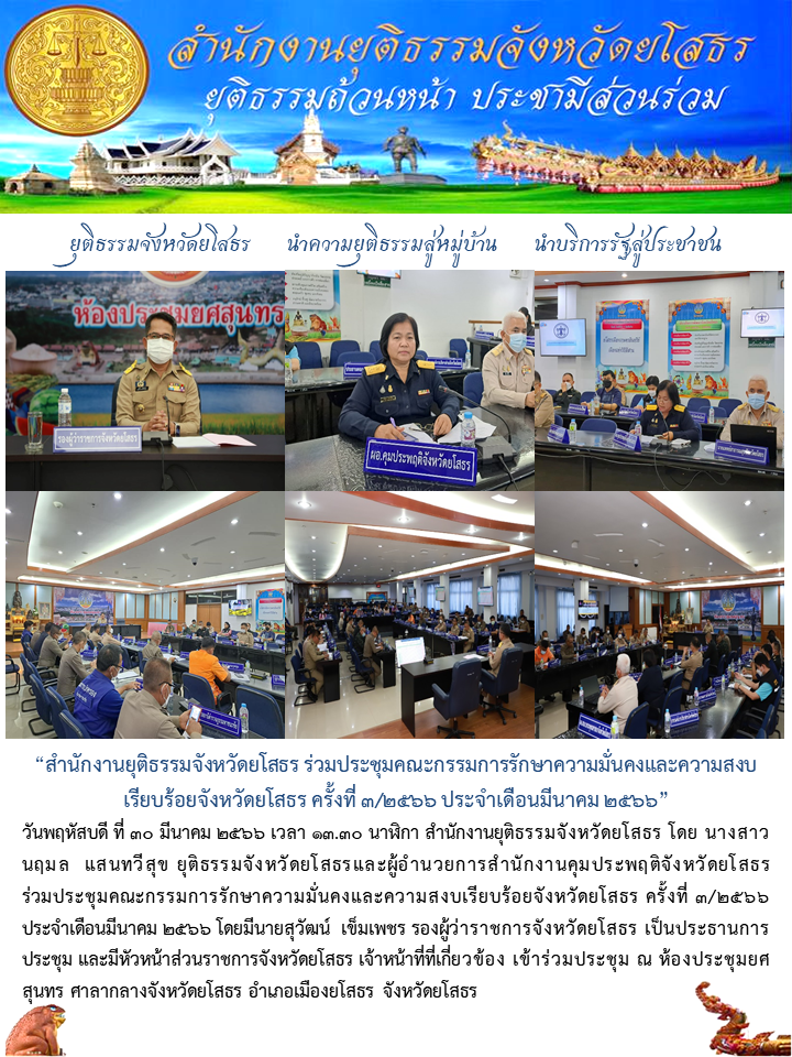 สำนักงานยุติธรรมจังหวัดยโสธร ร่วมประชุมคณะกรรมการรักษาความมั่นคงและความสงบเรียบร้อยจังหวัดยโสธร ครั้งที่ ๓/๒๕๖๖ ประจำเดือนมีนาคม ๒๕๖๖
