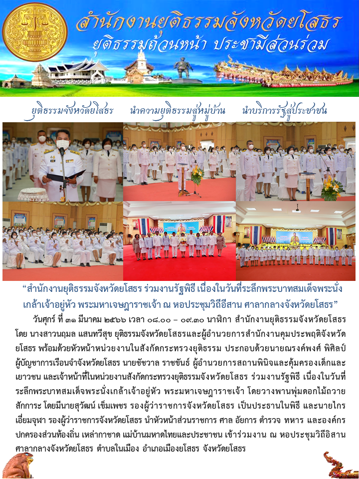 วันที่ 31 มี.ค. 2566 (15:05 น.)วันศุกร์ ที่ 31 มีนาคม 2566 เวลา 08.00 – 09.30 นาฬิกา สำนักงานยุติธรรมจังหวัดยโสธร โดย นางสาวนฤมล แสนทวีสุข ยุติธรรมจังหวัดยโสธรและผู้อำนวยการสำนักงานคุมประพฤติจังหวัดยโสธร พร้อมด้วยหัวหน้าหน่วยงานในสังกัดกระทรวงยุติธรรม ประกอบด้วยนายณรงค์พงศ์ พิศิลป์ ผู้บัญชาการเรือนจำจังหวัดยโสธร นายชัชวาล ราชขันธ์ ผู้อำนวยการสถานพินิจและคุ้มครองเด็กและเยาวชน และเจ้าหน้าที่ในหน่วยงานสังกัดกระทรวงยุติธรรมจังหวัดยโสธร ร่วมงานรัฐพิธี เนื่องในวันที่ระลึกพระบาทสมเด็จพระนั่งเกล้าเจ้าอยู่หัว พระมหาเจษฎาราชเจ้า โดยวางพานพุ่มดอกไม้ถวายสักการะ โดยมีนายสุวัฒน์ เข็มเพชร รองผู้ว่าราชการจังหวัดยโสธร เป็นประธานในพิธี และนายไกรเอี่ยมจุฬา รองผู้ว่าราชการจังหวัดยโสธร นำหัวหน้าส่วนราชการ ศาล อัยการ ตำรวจ ทหาร และองค์กรปกครองส่วนท้องถิ่น เหล่ากาชาด แม่บ้านมหาดไทยและประชาชน เข้าร่วมงาน ณ หอประชุมวิถีอิสาน ศาลากลางจังหวัดยโสธร ตำบลในเมือง อำเภอเมืองยโสธร จังหวัดยโสธร