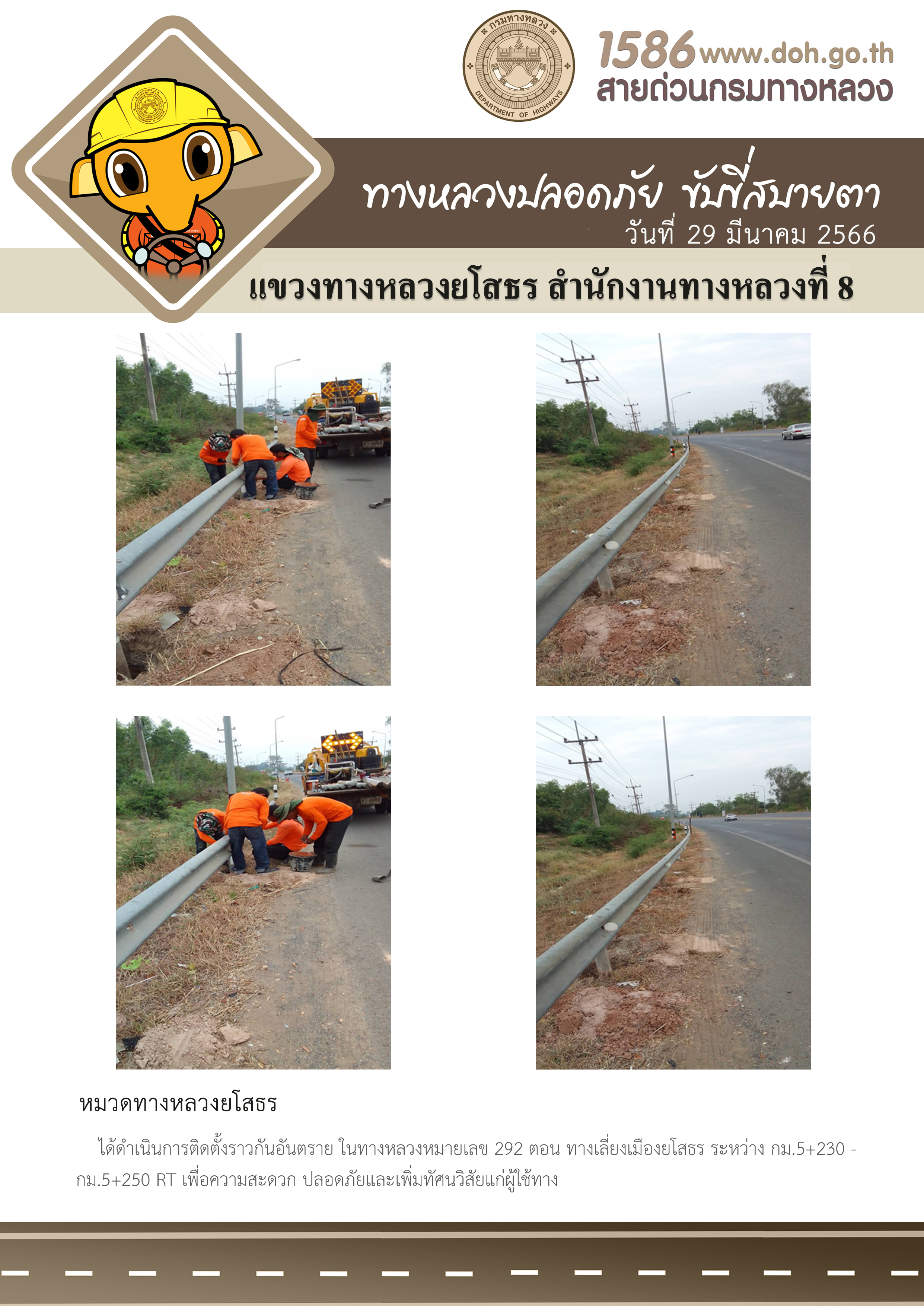 วันที่ 29 มีนาคม 2566 หมวดทางหลวงยโสธร ได้ดำเนินการติดตั้งราวกันอันตราย ในทางหลวงหมายเลข 292 ตอน ทางเลี่ยงเมืองยโสธร ระหว่าง กม.5+230 - กม.5+250 RT เพื่อความสะดวก ปลอดภัยและเพิ่มทัศนวิสัยแก่ผู้ใช้ทาง