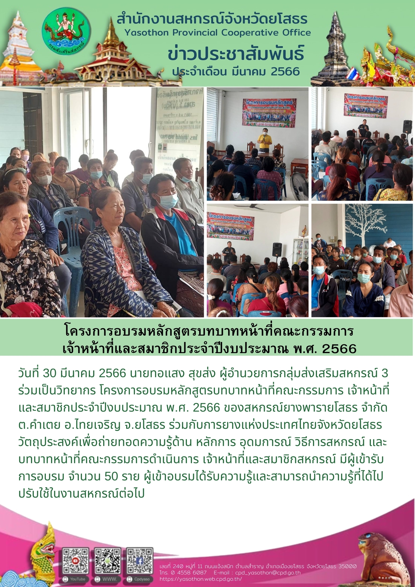 เจ้าหน้าที่สหกรณ์จังหวัดยโสธร ร่วมเป็นวิทยากรโครงการอบรมหลักสูตรบทบาทหน้าที่คณะกรรมการ ณ สหกรณ์ยางพารายโสธร
