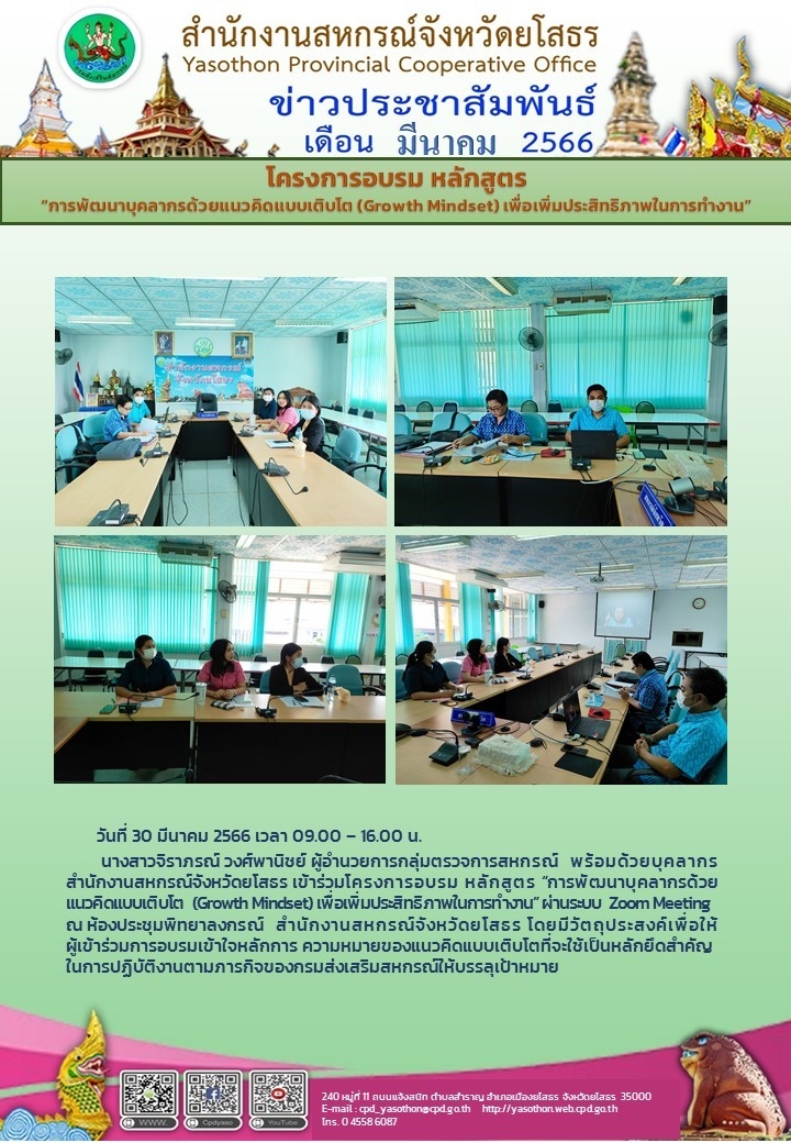 เจ้าหน้าที่สำนักงานสหกรณ์จังหวัดยโสธร เข้าร่วมโครงการอบรมหลักสูตร "การพัฒนาบุคลากรด้วยแนวคิดแบบเติบโต" (Growth Mindset) ผ่านระบบ Zoom Meeting ณ ห้องพิทยาลงกรณ์ สำนักงานสหกรณ์จังหวัดยโสธร