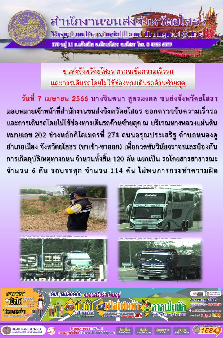 วันที่ 7 เมษายน 2566 เจ้าหน้าที่สำนักงานขนส่งจังหวัดยโสธร ออกตั้งจุดตรวจจับความเร็ว