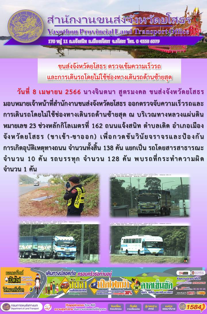 วันที่ 8 เมษายน 2566 เจ้าหน้าที่สำนักงานขนส่งจังหวัดยโสธร ออกตั้งจุดตรวจจับความเร็ว