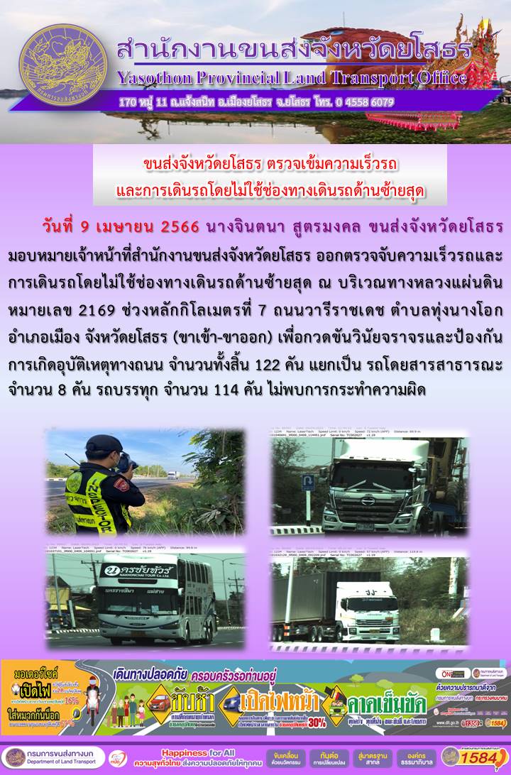 วันที่ 9 เมษายน 2566 เจ้าหน้าที่สำนักงานขนส่งจังหวัดยโสธร ออกตั้งจุดตรวจจับความเร็ว