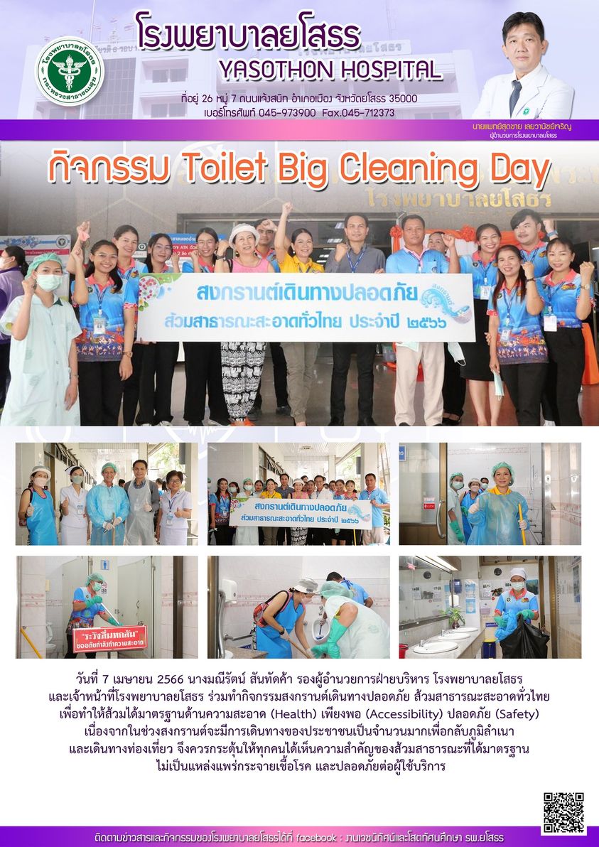 วันที่ 10 เม.ย. 2566 (08:54 น.)วันที่ 7 เมษายน 2566 นางมณีรัตน์ สันทัดค้า รองผู้อำนวยการฝ่ายบริหาร โรงพยาบาลยโสธร และเจ้าหน้าที่โรงพยาบาลยโสธร ร่วมทำกิจกรรมสงกรานต์เดินทางปลอดภัย ส้วมสาธารณะสะอาดทั่วไทย เพื่อทำให้ส้วมได้มาตรฐานด้านความสะอาด (Health) เพียงพอ (Accessibility) ปลอดภัย (Safety) เนื่องจากในช่วงสงกรานต์จะมีการเดินทางของประชาชนเป็นจำนวนมากเพื่อกลับภูมิลำเนา และเดินทางท่องเที่ยว จึงควรกระตุ้นให้ทุกคนได้เห็นความสำคัญของส้วมสาธารณะที่ได้มาตรฐาน ไม่เป็นแหล่งแพร่กระจายเชื้อโรค และปลอดภัยต่อผู้ใช้บริการ
