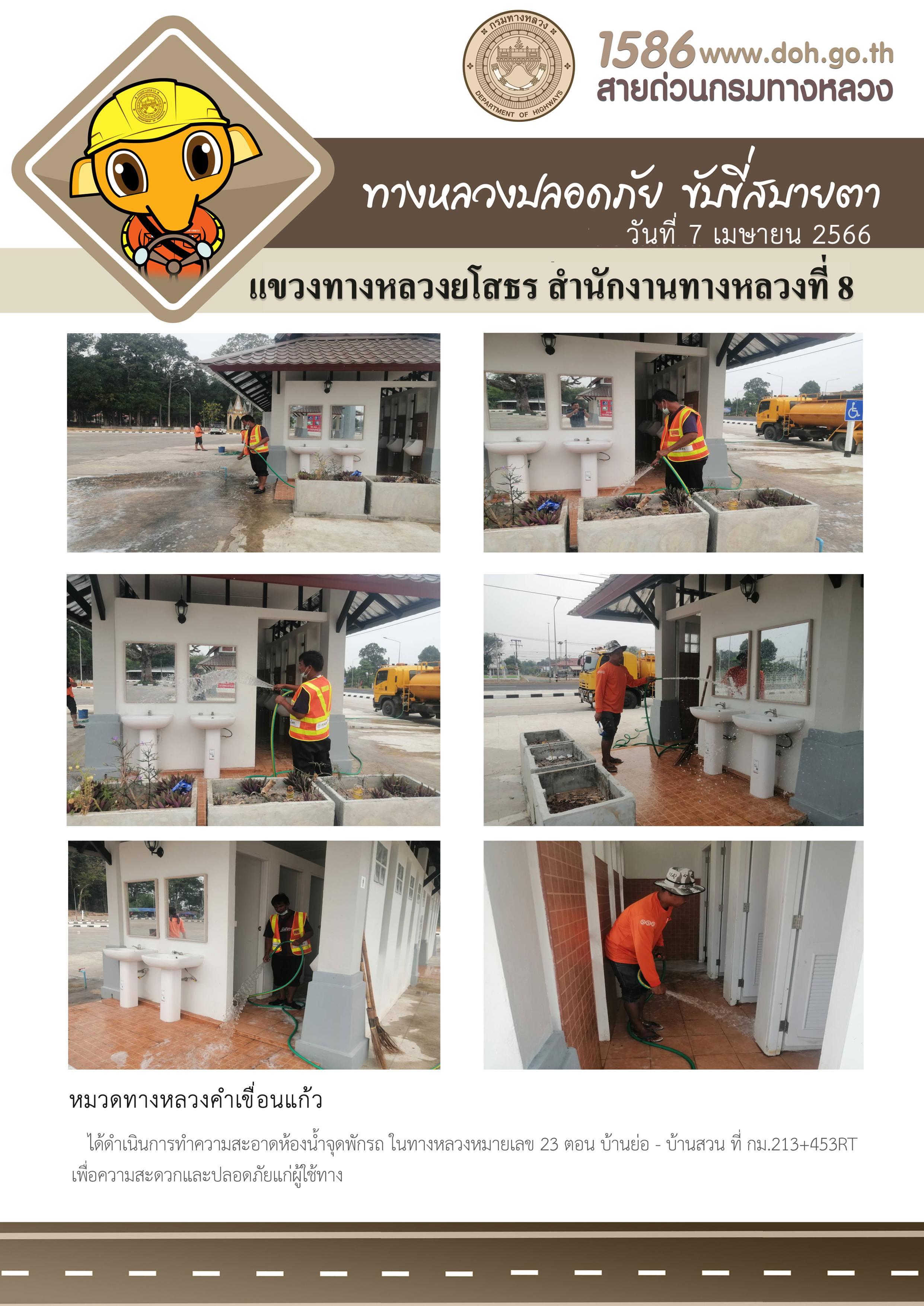 วันที่ 7 เมษายน 2566 หมวดทางหลวงคำเขื่อนแก้ว ได้ดำเนินการทำความสะอาดห้องน้ำจุดพักรถ ในทางหลวงหมายเลข 23 ตอน บ้านย่อ - บ้านสวน ที่ กม.213+453 RT เพื่อความสะดวกและปลอดภัยแก่ผู้ใช้ทาง