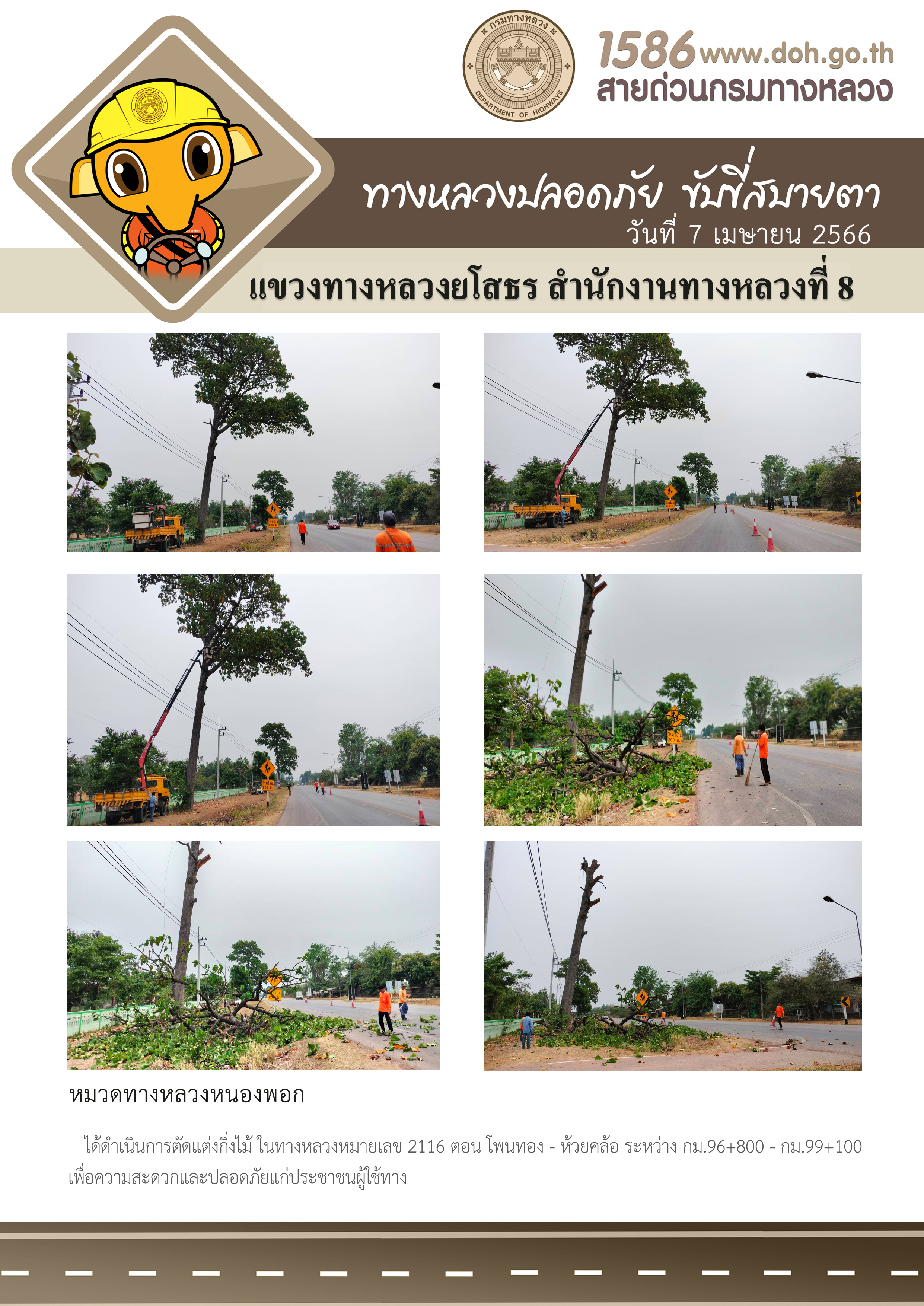 วันที่ 7 เมษายน 2566 หมวดทางหลวงหนองพอก ได้ดำเนินการตัดแต่งกิ่งไม้ ในทางหลวงหมายเลข 2116 ตอน โพนทอง - ห้วยคล้อ ระหว่าง กม.96+800-กม.99+100 เพื่อความสะดวกและปลอดภัยแก่ประชาชนผู้ใช้ทาง