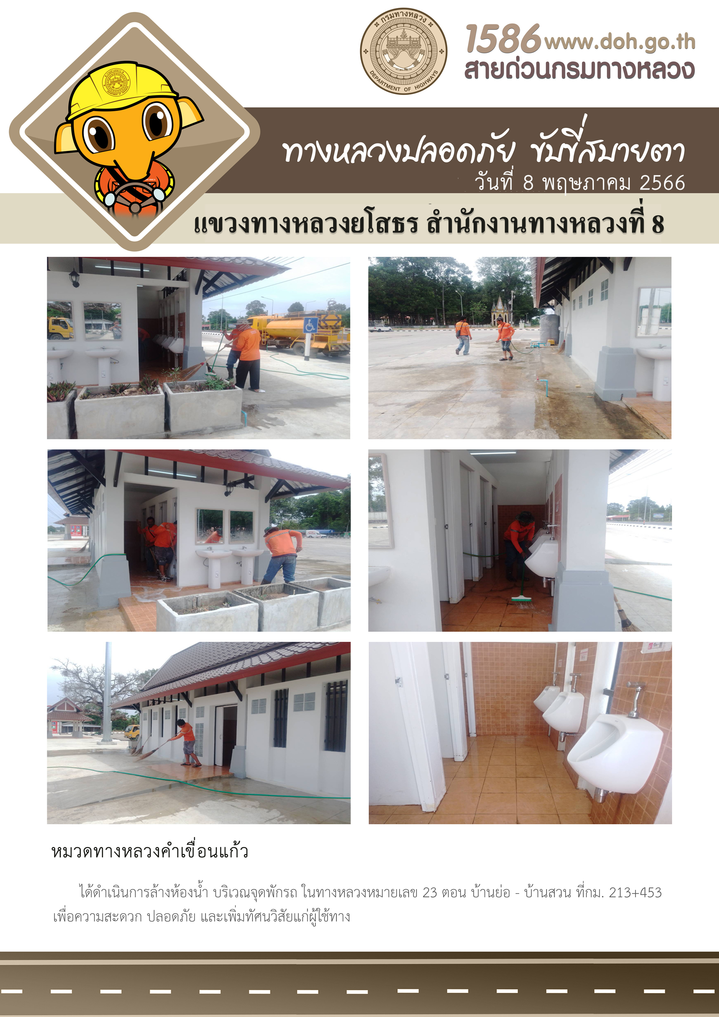 วันที่ 8 พฤษภาคม 2566 หมวดทางหลวงคำเขื่อนแก้ว ได้ดำเนินการล้างห้องน้ำ บริเวณจุดพักรถ ในทางหลวงหมายเลข 23 ตอน บ้านย่อ - บ้านสวน ที่ กม.213+453 เพื่อความสะดวก ปลอดภัย และเพิ่มทัศนวิสัยแก่ผู้ใช้ทาง