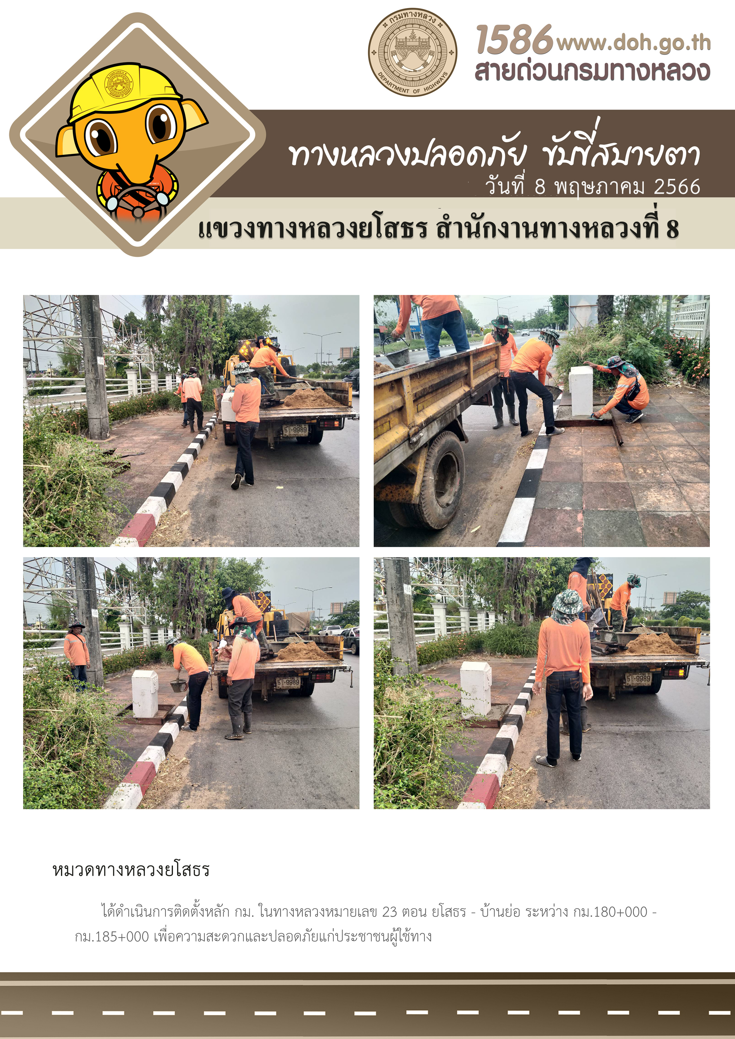 วันที่ 8 พฤษภาคม 2566 หมวดทางหลวงยโสธร ได้ดำเนินการติดตั้งหลัก กม.ในทางหลวงหมายเลข 23 ตอน ยโสธร - บ้านย่อ ระหว่าง กม.180+000 - กม.185+000 เพื่อความสะดวกและปลอดภัยแก่ประชาชนผู้ใช้ทาง