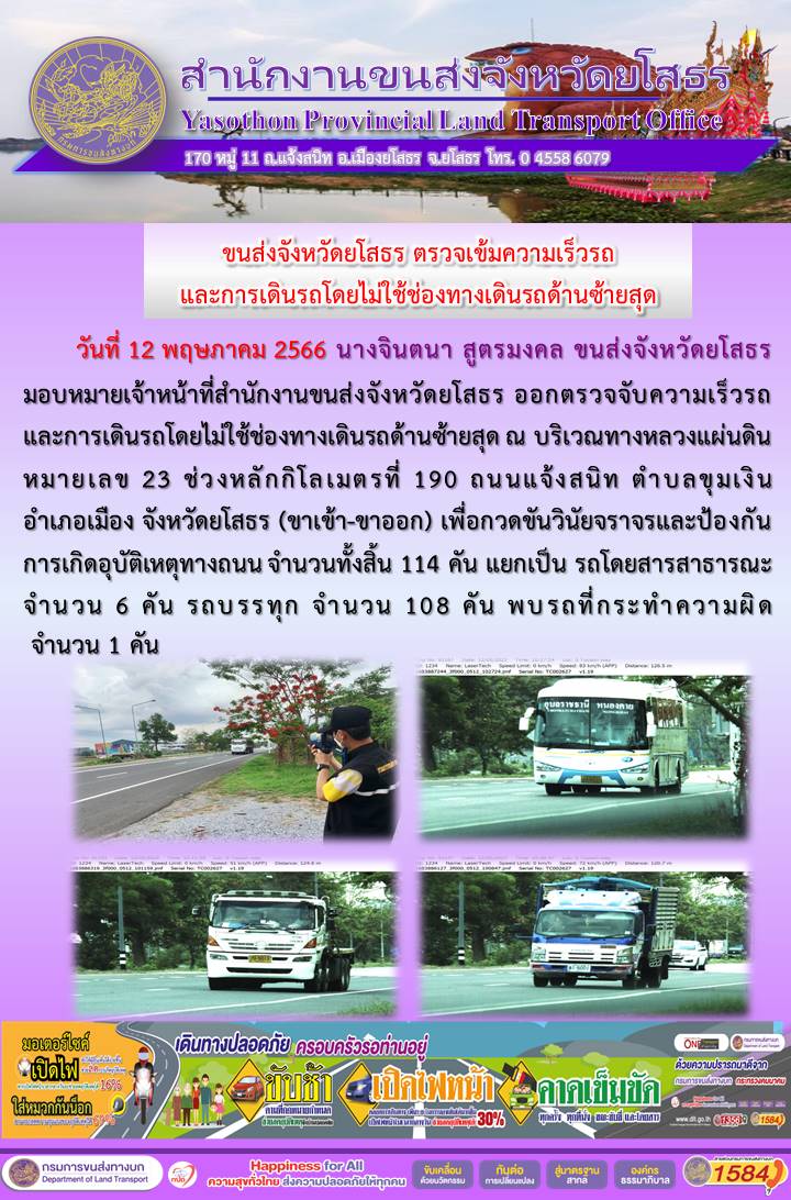 วันที่ 12 พฤษาคม 2566 เจ้าหน้าที่สำนักงานขนส่งจังหวัดยโสธร ออกตั้งจุดตรวจจับความเร็ว
