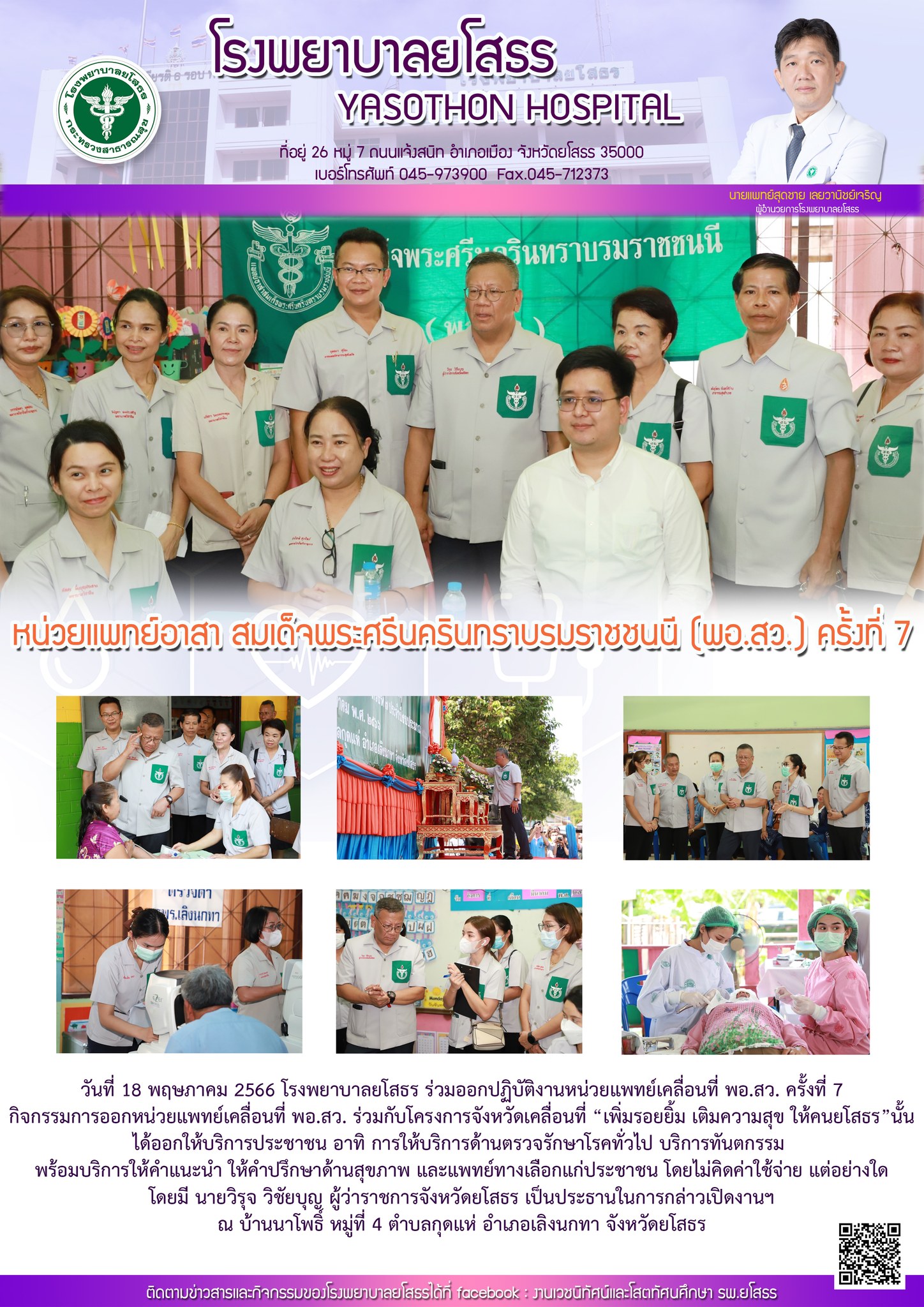 วันที่ 18 พ.ค. 2566 (15:51 น.)วันที่ 18 พฤษภาคม 2566 โรงพยาบาลยโสธร ร่วมออกปฏิบัติงานหน่วยแพทย์เคลื่อนที่ พอ.สว. ครั้งที่ 7 กิจกรรมการออกหน่วยแพทย์เคลื่อนที่ พอ.สว. ร่วมกับโครงการจังหวัดเคลื่อนที่ “เพิ่มรอยยิ้ม เติมความสุข ให้คนยโสธร” นั้น ได้ออกให้บริการประชาชน อาทิ การให้บริการด้านตรวจรักษาโรคทั่วไป บริการทันตกรรม พร้อมบริการให้คำแนะนำ ให้คำปรึกษาด้านสุขภาพ และแพทย์ทางเลือกแก่ประชาชน โดยไม่คิดค่าใช้จ่าย แต่อย่างใด