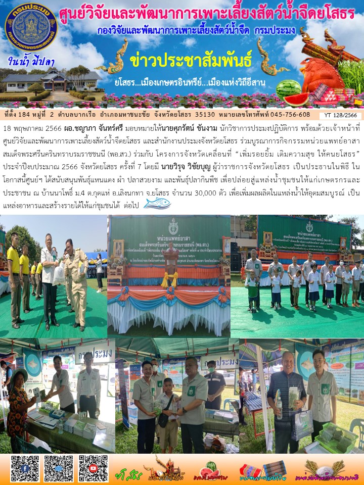 เจ้าหน้าที่ศูนย์วิจัยและพัฒนาการเพาะเลี้ยงสัตว์น้ำจืดยโสธร และสนง.ปจ.ยโสธร ร่วมบูรณาการกิจกรรมหน่วยแพทย์อาสาสมเด็จพระศรีนครินทราบรมราชชนนี (พอ.สว.) ร่วมกับ โครงการจังหวัดเคลื่อนที่ “เพิ่มรอยยิ้ม เติมความสุข ให้คนยโสธร” ประจำปีงบประมาณ 2566 ครั้งที่ 7