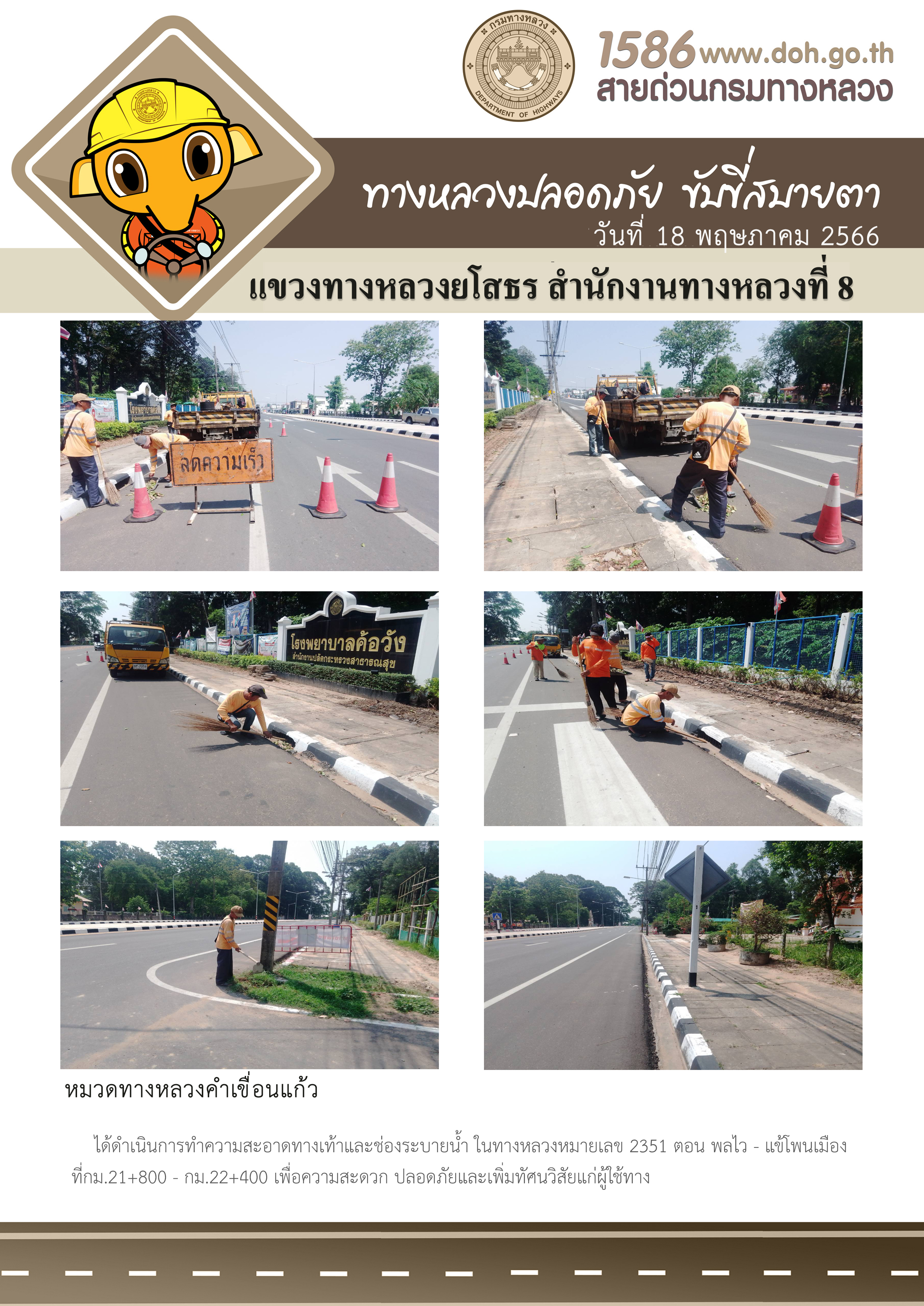 วันที่ 18 พฤษภาคม 2566 หมวดทางหลวงคำเขื่อนแก้ว ได้ดำเนินการทำความสะอาดทางเท้าและช่องระบายน้ำ ในทางหลวงหมายเลข 2351 ตอน พลไว - แข้โพนเมือง ที่ กม.21+800 - กม.22+400 เพื่อความสะดวก ปลอดภัยและเพิ่มทัศนวิสัยแก่ผู้ใช้ทาง