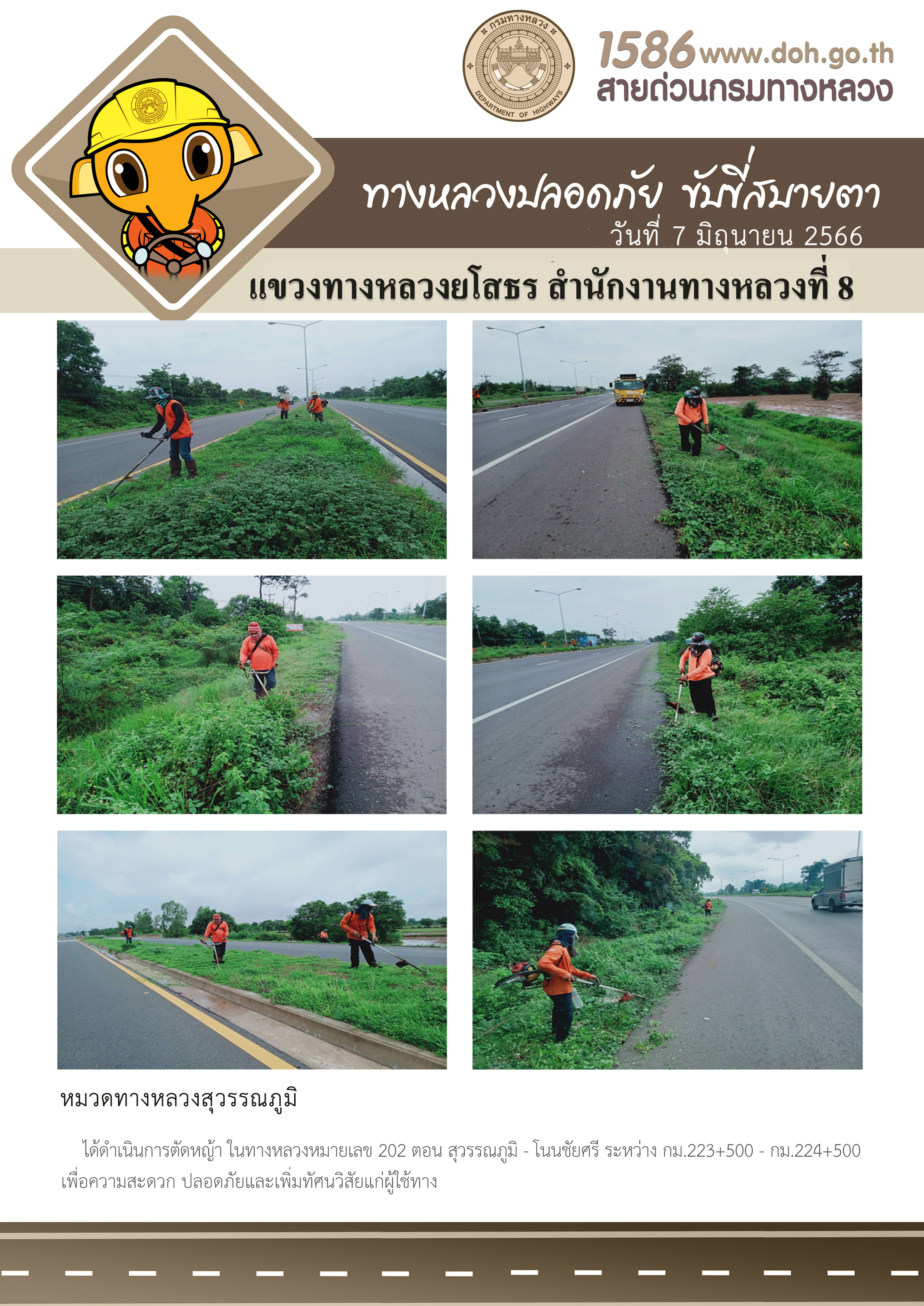 วันที่ 7 มิถุนายน 2566 หมวดทางหลวงสุวรรณภูมิ ได้ดำเนินการตัดหญ้า ในทางหลวงหมายเลข 202 ตอน สุวรรณภูมิ - โนนชัยศรี ระหว่าง กม.223+500 - กม.224+500 เพื่อความสะดวก ปลอดภัยและเพิ่มทัศนวิสัยแก่ผู้ใช้ทาง