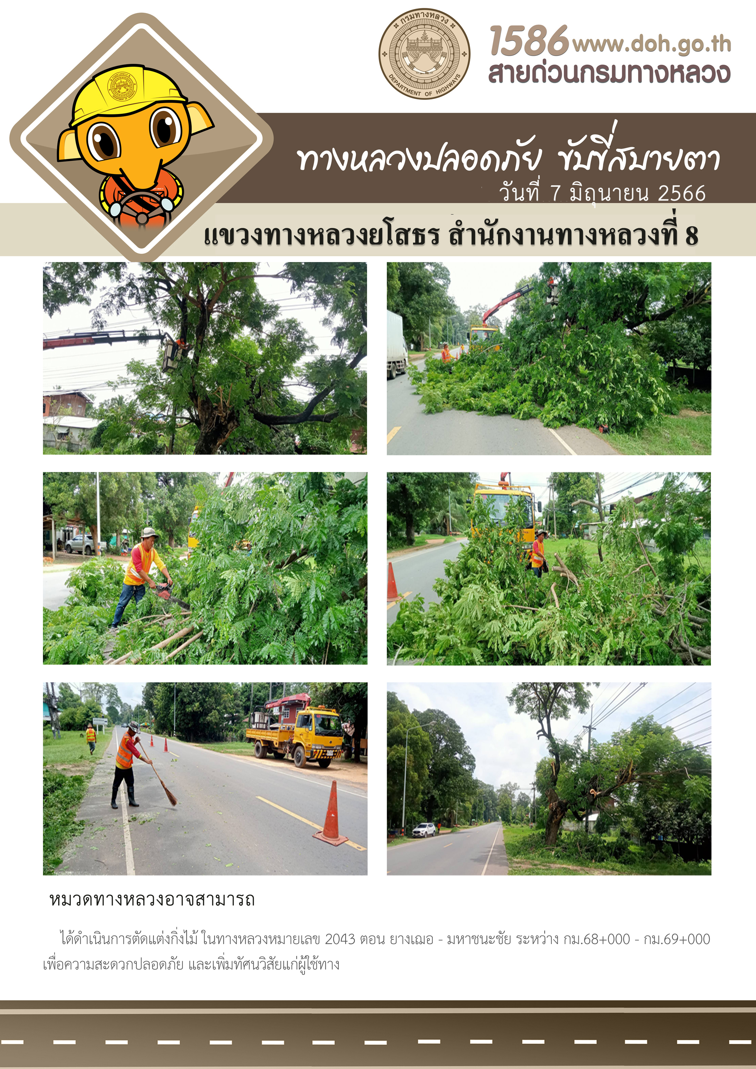 วันที่ 7 มิถุนายน 2566 หมวดทางหลวงอาจสามารถ ได้ดำเนินการตัดแต่งกิ่งไม้ ในทางหลวงหมายเลข 2043 ตอน ยางเฌอ - มหาชนะชัย ระหว่าง กม.68+000 - กม.69+000 เพื่อความสะดวกปลอดภัย และเพิ่มทัศนวิสัยแก่ผู้ใช้ทาง