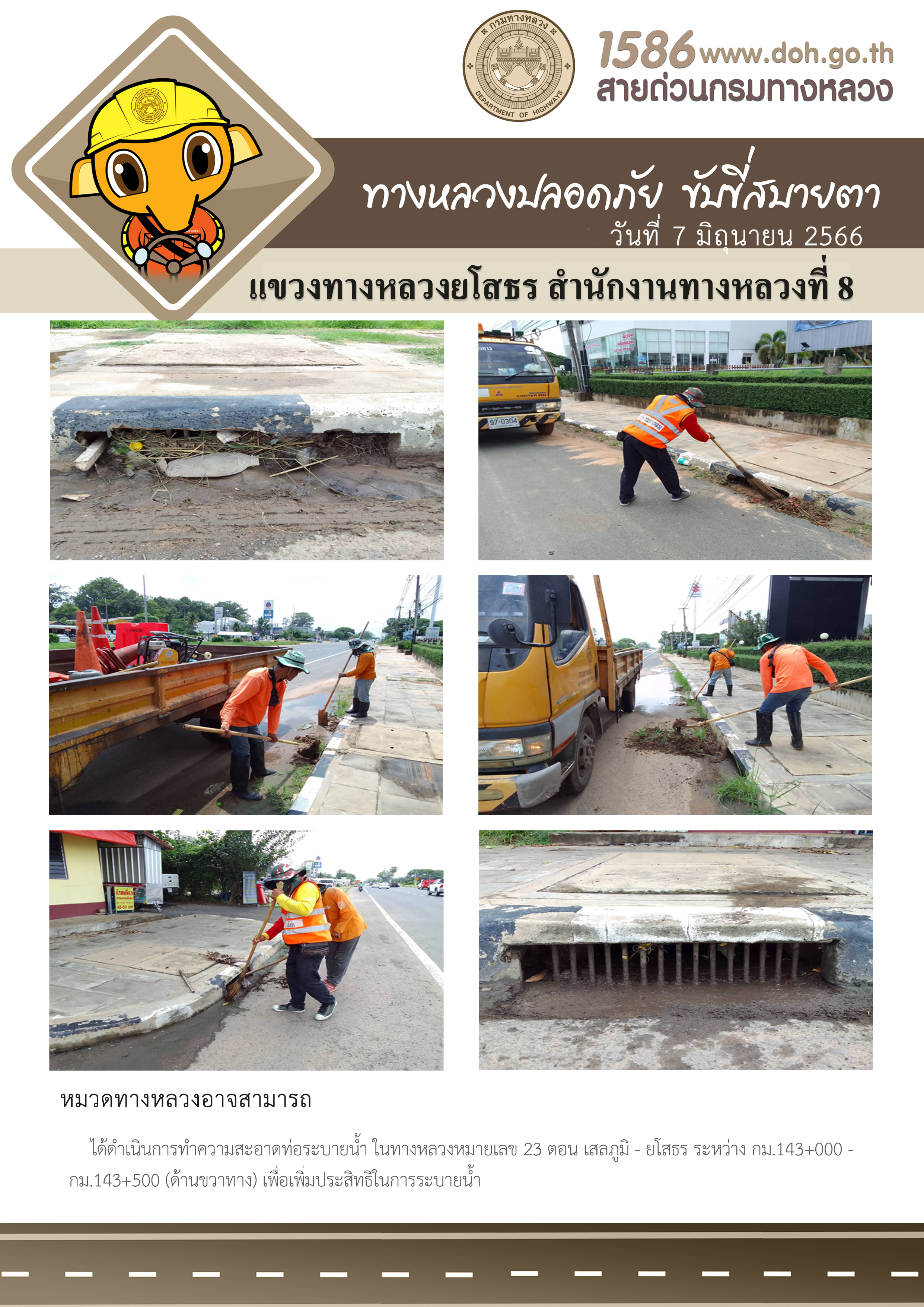 วันที่ 7 มิถุนายน 2566 หมวดทางหลวงอาจสามารถ ได้ดำเนินการทำความสะอาดท่อระบายน้ำ ในทางหลวงหมายเลข 23 ตอน เสลภูมิ - ยโสธร ระหว่าง กม.143+000 - กม.143+500 (ด้านขวาทาง) เพื่อเพิ่มประสิทธิในการระบายน้ำ