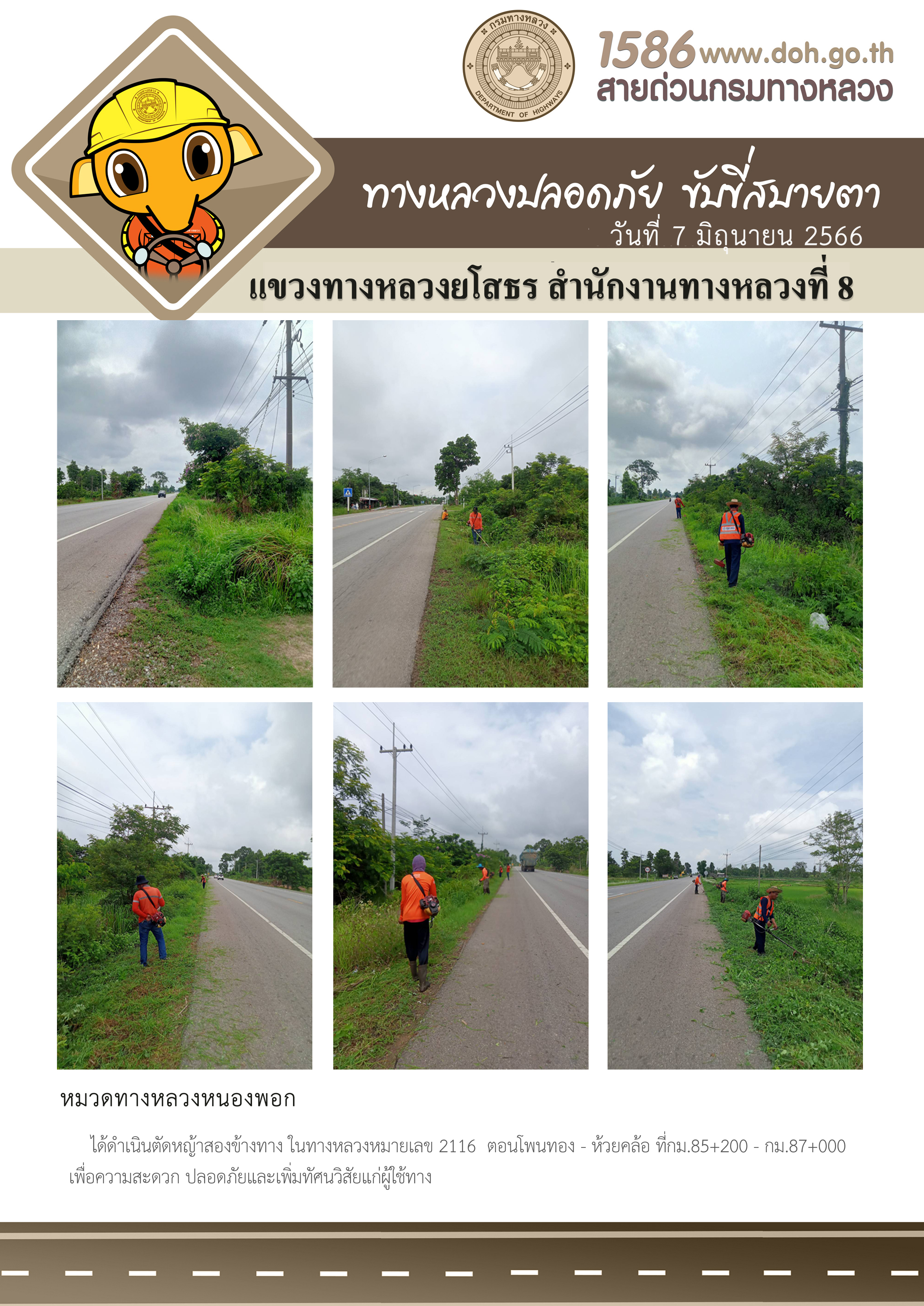วันที่ 7 มิถุนายน 2566 หมวดทางหลวงหนองพอก ได้ดำเนินการตัดหญ้าสองข้างทาง ในทางหลวงหมายเลข 2116 ตอนโพนทอง - ห้วยคล้อ ที่กม.85+200 - กม.87+000 เพื่อความสะดวก ปลอดภัยและเพิ่มทัศนวิสัยแก่ผู้ใช้ทาง