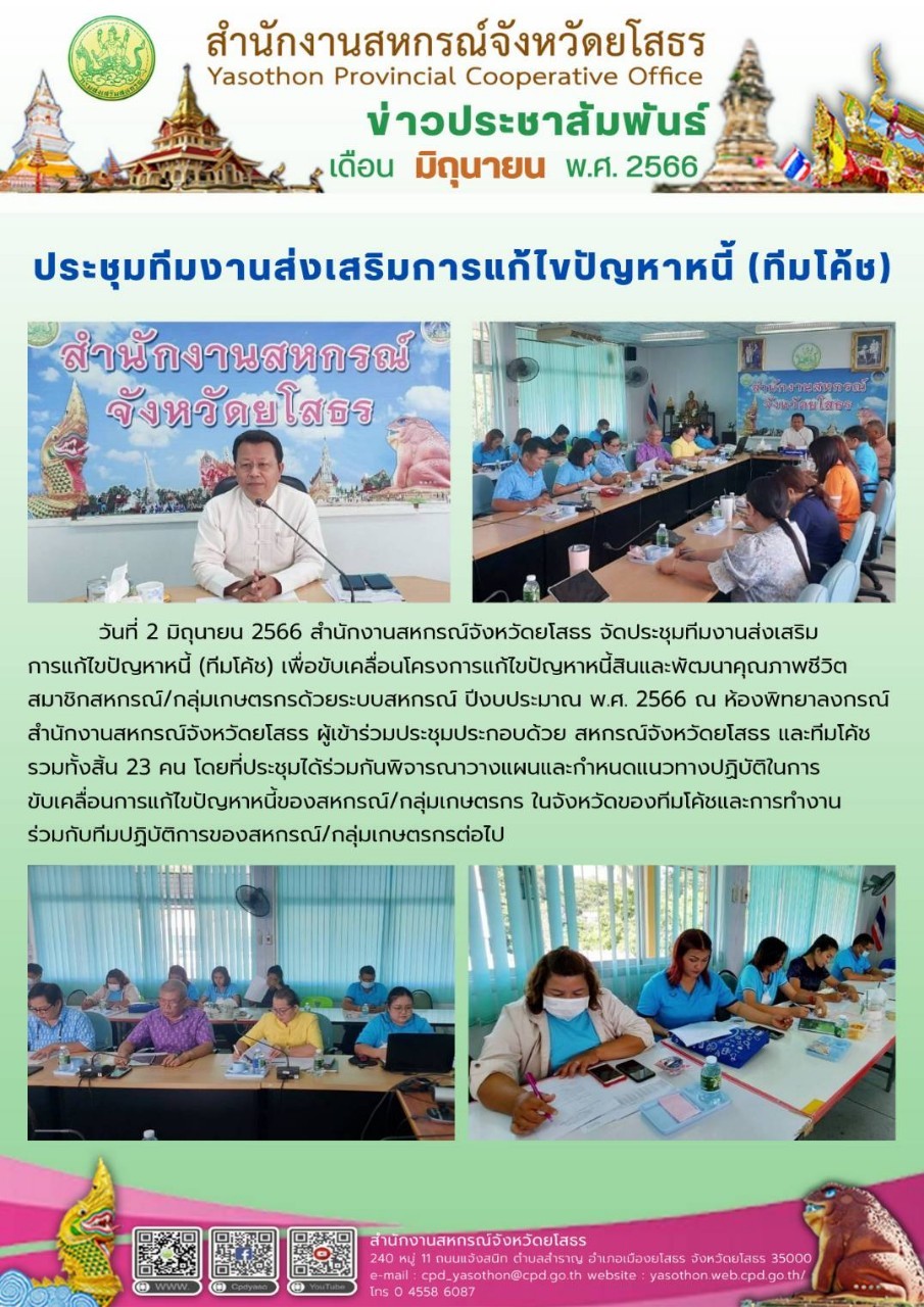 นายปรีชา ลาภารัตน์ สหกรณ์จังหวัดยโสธรพร้อมด้วยเจ้าหน้าที่สำนักงานสหกรณ์จังหวัดยโสธร จัดประชุมทีมงานส่งเสริมการแก้ไขปัญหาหนี้(ทีมโค้ช) เพื่อขับเคลื่อนโครงการแก้ไขปัญหาหนี้สินและพัฒนาคุณภาพชีวิตสมาชิกสหกรณ์/กลุ่มเกษตรกรด้วยระบบสหกรณ์