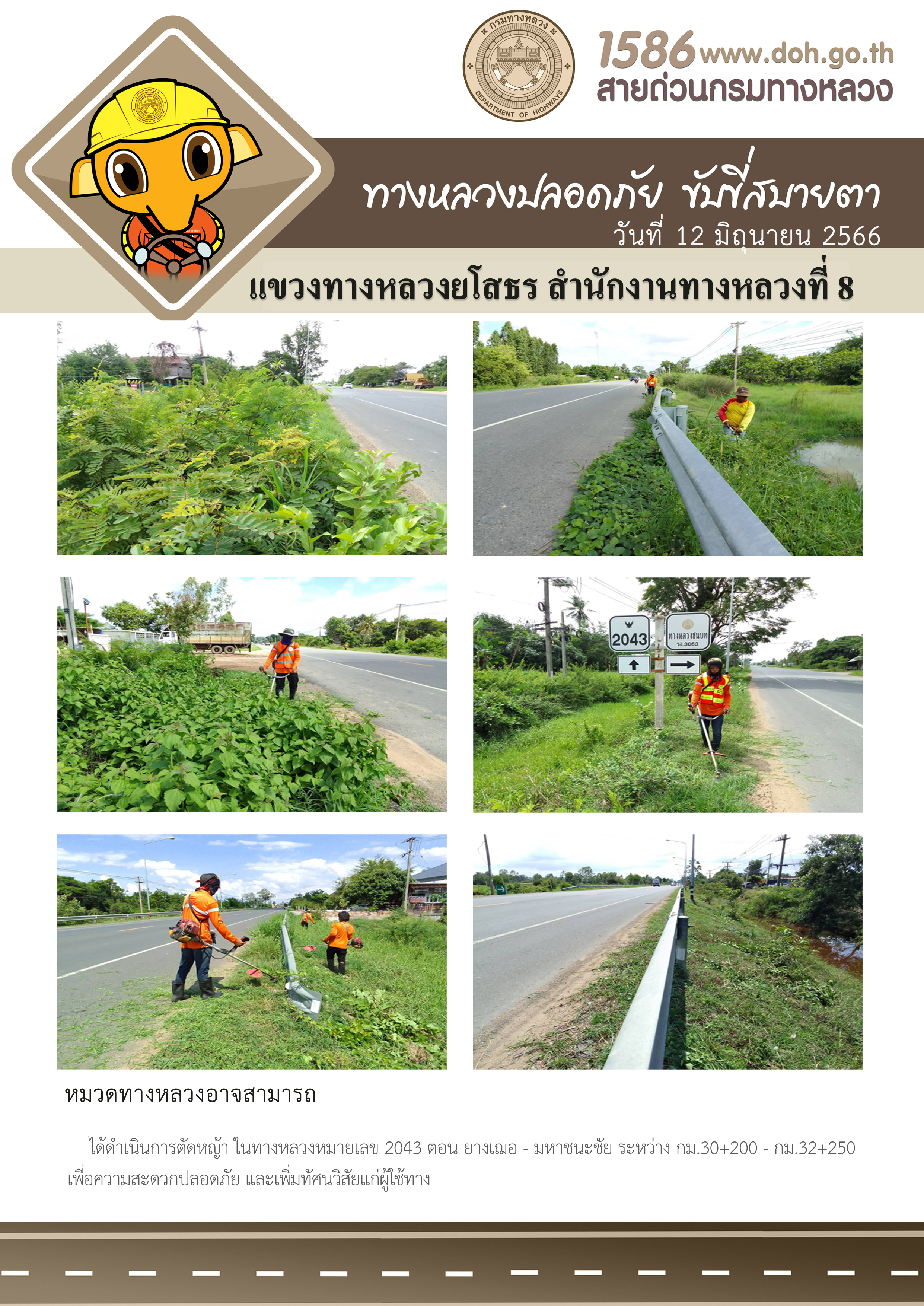 วันที่ 12 มิถุนายน 2566 หมวดทางหลวงอาจสามารถ ได้ดำเนินการตัดหญ้า ในทางหลวงหมายเลข 2043 ตอน ยางเฌอ - มหาชนะชัย ระหว่าง กม.30+200 - กม.32+250 เพื่อความสะดวกปลอดภัย และเพิ่มทัศนวิสัยแก่ผู้ใช้ทาง