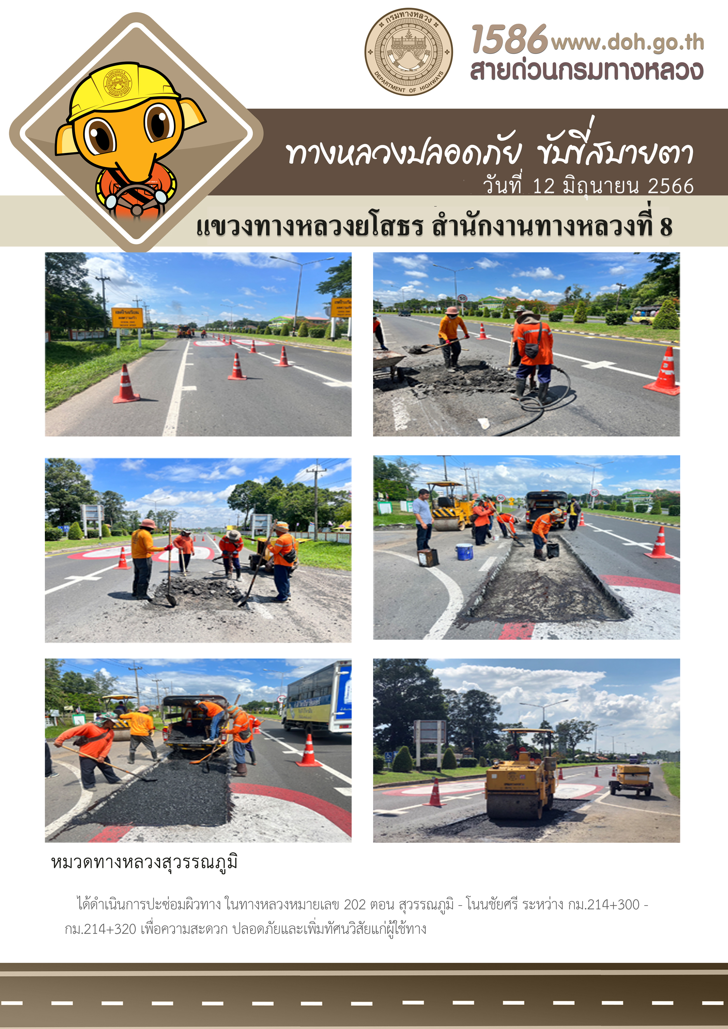 วันที่ 12 มิถุนายน 2566 หมวดทางหลวงสุวรรณภูมิ ได้ดำเนินการปะซ่อมผิวทาง ในทางหลวงหมายเลข 202 ตอน สุวรรณภูมิ - โนนชัยศรี ระหว่าง กม.214+300 - กม.214+ 320 เพื่อความสะดวก ปลอดภัยและเพิ่มทัศนวิสัยแก่ผู้ใช้ทาง