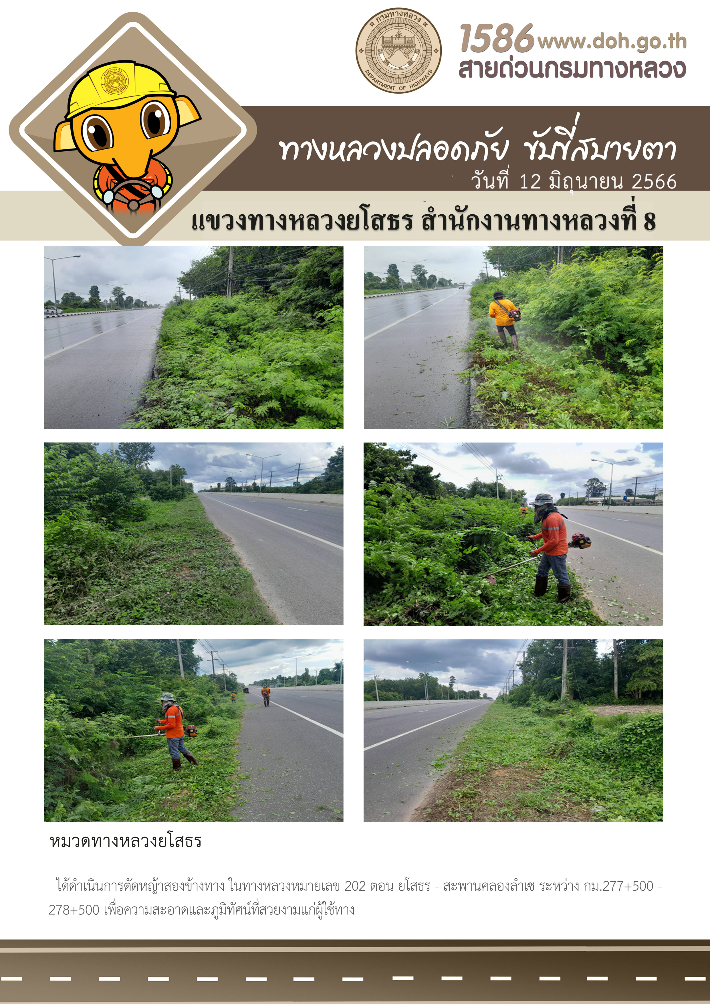 วันที่ 12 มิถุนายน 2566 หมวดทางหลวงยโสธร ได้ดำเนินการตัดหญ้าสองข้างทาง ในทางหลวงหมายเลข 202 ตอน ยโสธร - สะพานคลองลำเซ ระหว่าง กม.277+500 - กม.278+500 เพื่อความสะอาดและภูมิทัศน์ที่สวยงามแก่ผู้ใช้ทาง
