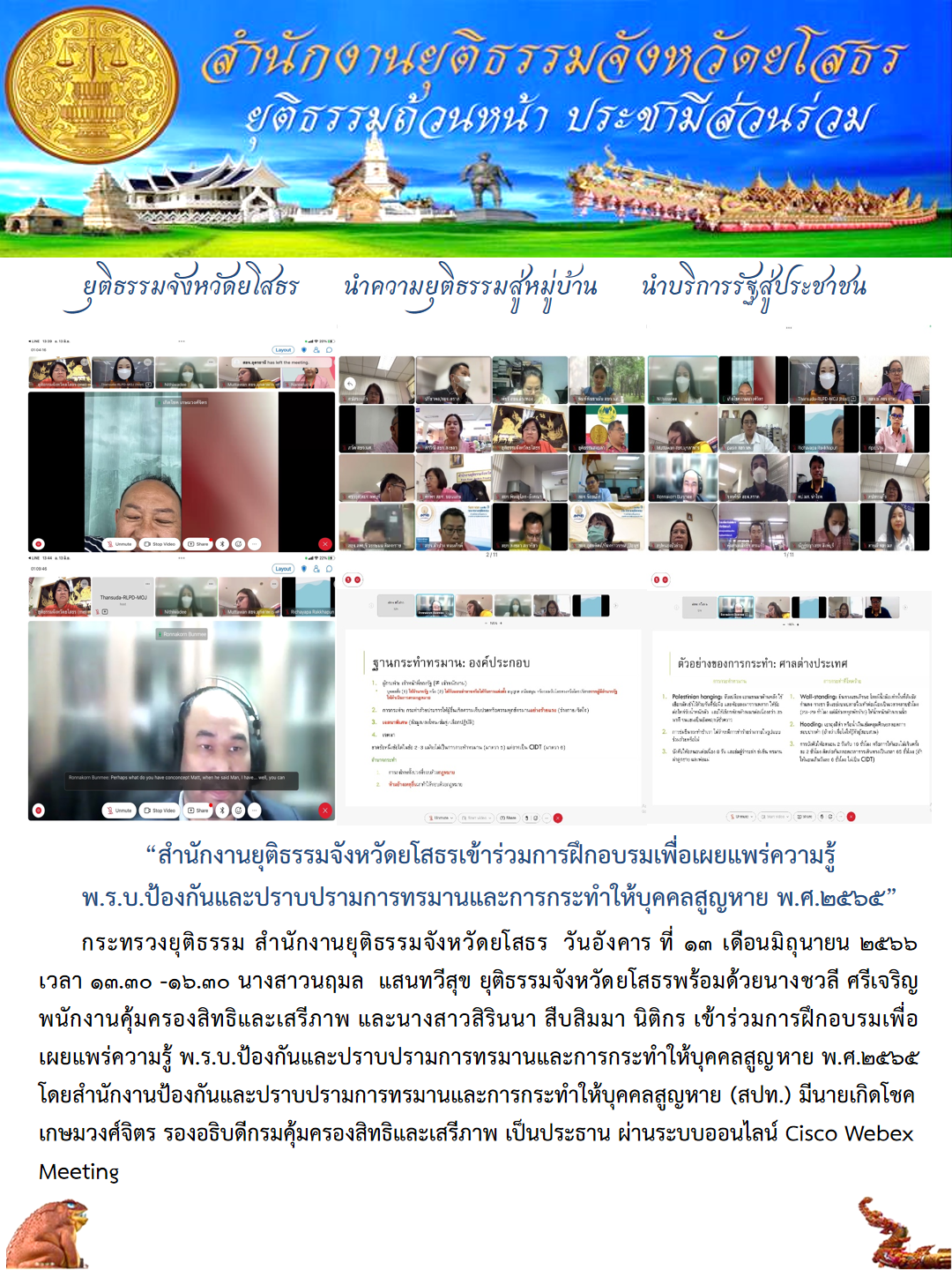 วันที่ 13 มิ.ย. 2566 (18:51 น.)กระทรวงยุติธรรม สำนักงานยุติธรรมจังหวัดยโสธร วันอังคาร ที่ 13 เดือนมิถุนายน 2566 เวลา 13.30 -16.30 นางสาวนฤมล แสนทวีสุข ยุติธรรมจังหวัดยโสธรพร้อมด้วยนางชวลี ศรีเจริญ พนักงานคุ้มครองสิทธิและเสรีภาพ และนางสาวสิรินนา สืบสิมมา นิติกร เข้าร่วมการฝึกอบรมเพื่อเผยแพร่ความรู้ พ.ร.บ.ป้องกันและปราบปรามการทรมานและการกระทำให้บุคคลสูญหาย พ.ศ.2565 โดยสำนักงานป้องกันและปราบปรามการทรมานและการกระทำให้บุคคลสูญหาย (สปท.) มีนายเกิดโชค เกษมวงศ์จิตร รองอธิบดีกรมคุ้มครองสิทธิและเสรีภาพ เป็นประธาน ผ่านระบบออนไลน์ Cisco Webex Meeting