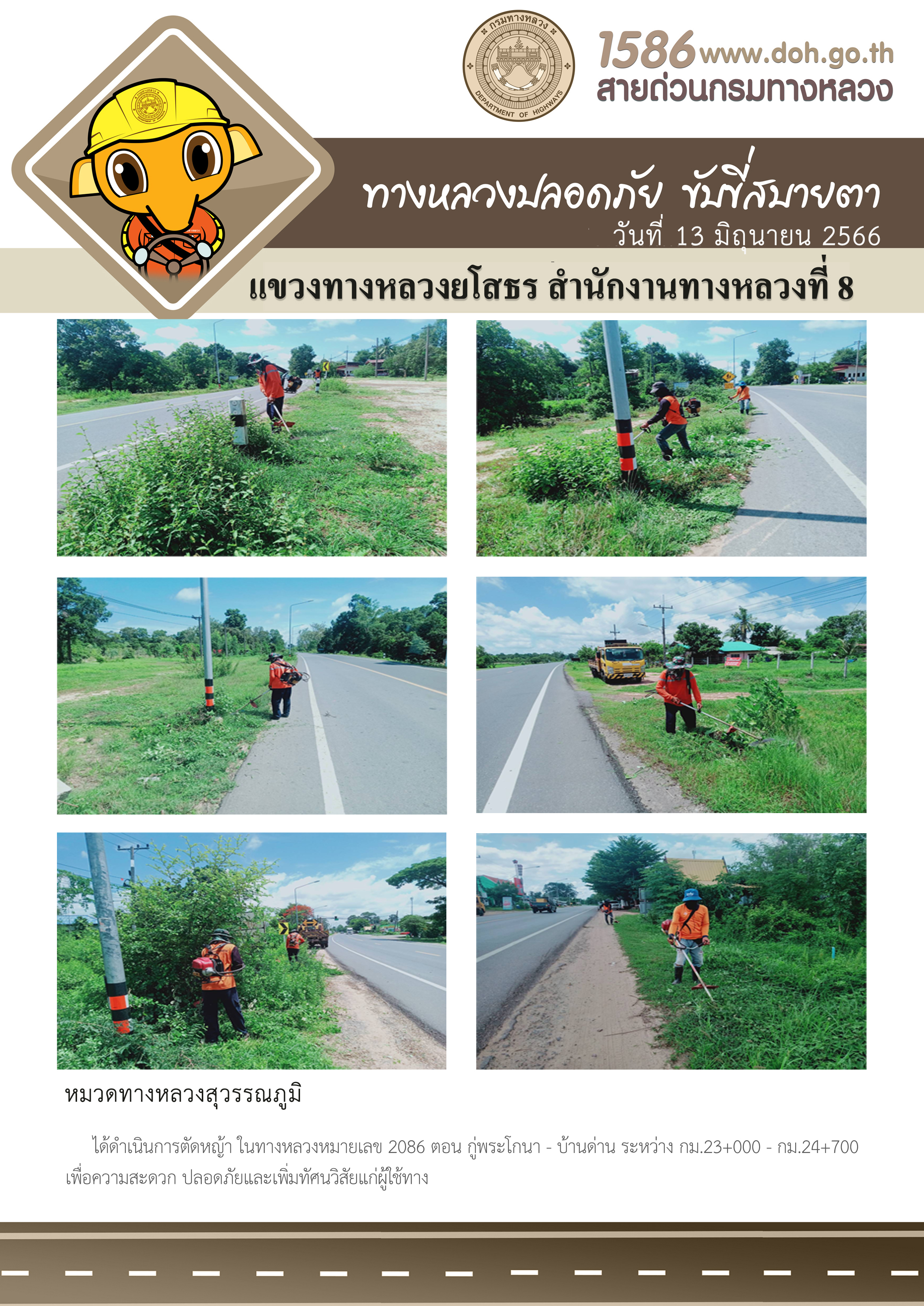 วันที่ 13 มิถุนายน 2566 หมวดทางหลวงสุวรรณภูมิ ได้ดำเนินการตัดหญ้า ในทางหลวงหมายเลข 2086 ตอน กู่พระโกนา - บ้านด่าน ระหว่าง กม.23+000 - กม.24+700 เพื่อความสะดวก ปลอดภัยและเพิ่มทัศนวิสัยแก่ผู้ใช้ทาง