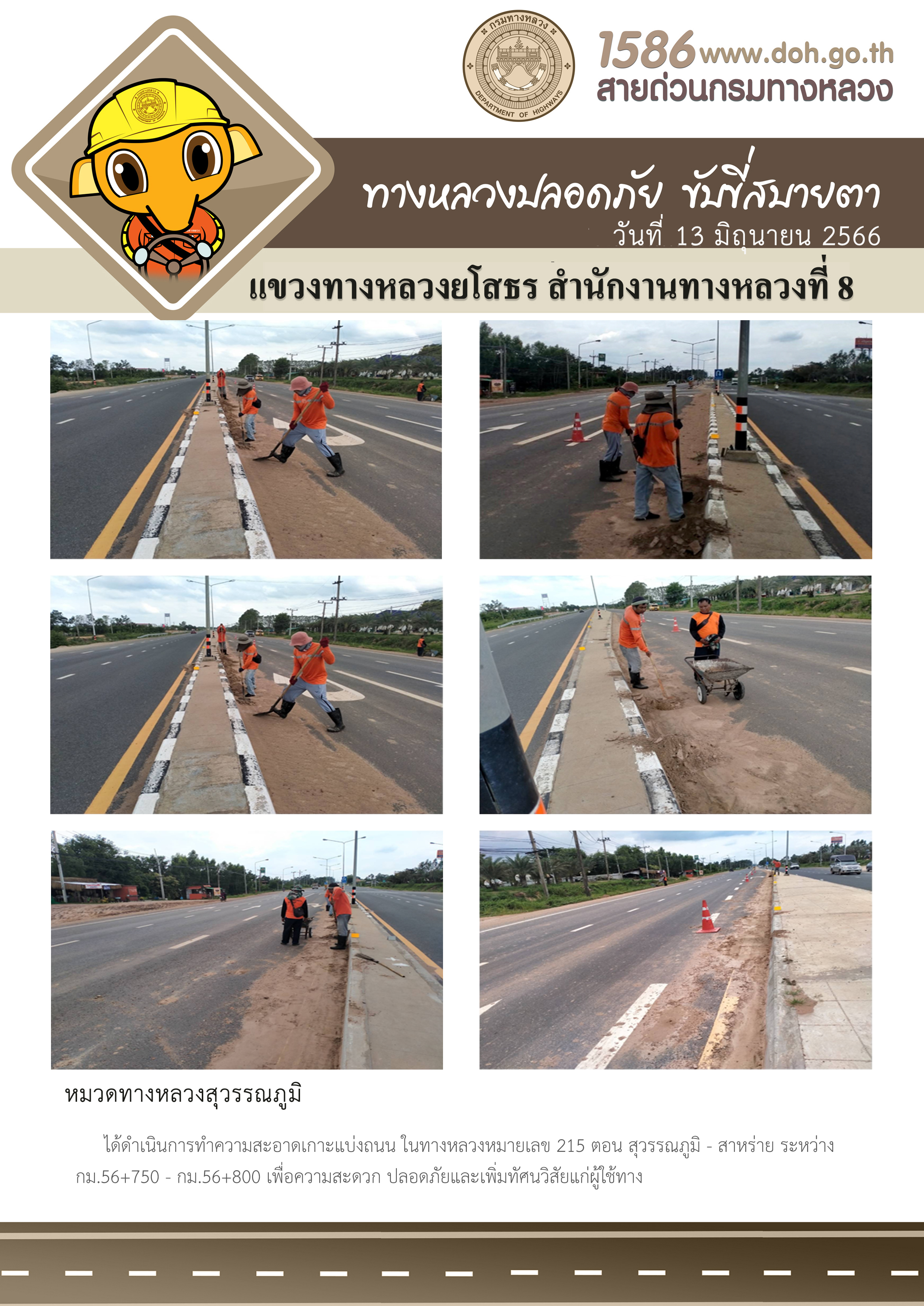 วันที่ 13 มิถุนายน 2566 หมวดทางหลวงสุวรรณภูมิ ได้ดำเนินการทำความสะอาดเกาะแบ่งถนน ในทางหลวงหมายเลข 215 ตอน สุวรรณภูมิ - สาหร่าย ระหว่าง กม.56+750 - กม.56+800 เพื่อความสะดวก ปลอดภัยและเพิ่มทัศนวิสัยแก่ผู้ใช้ทาง