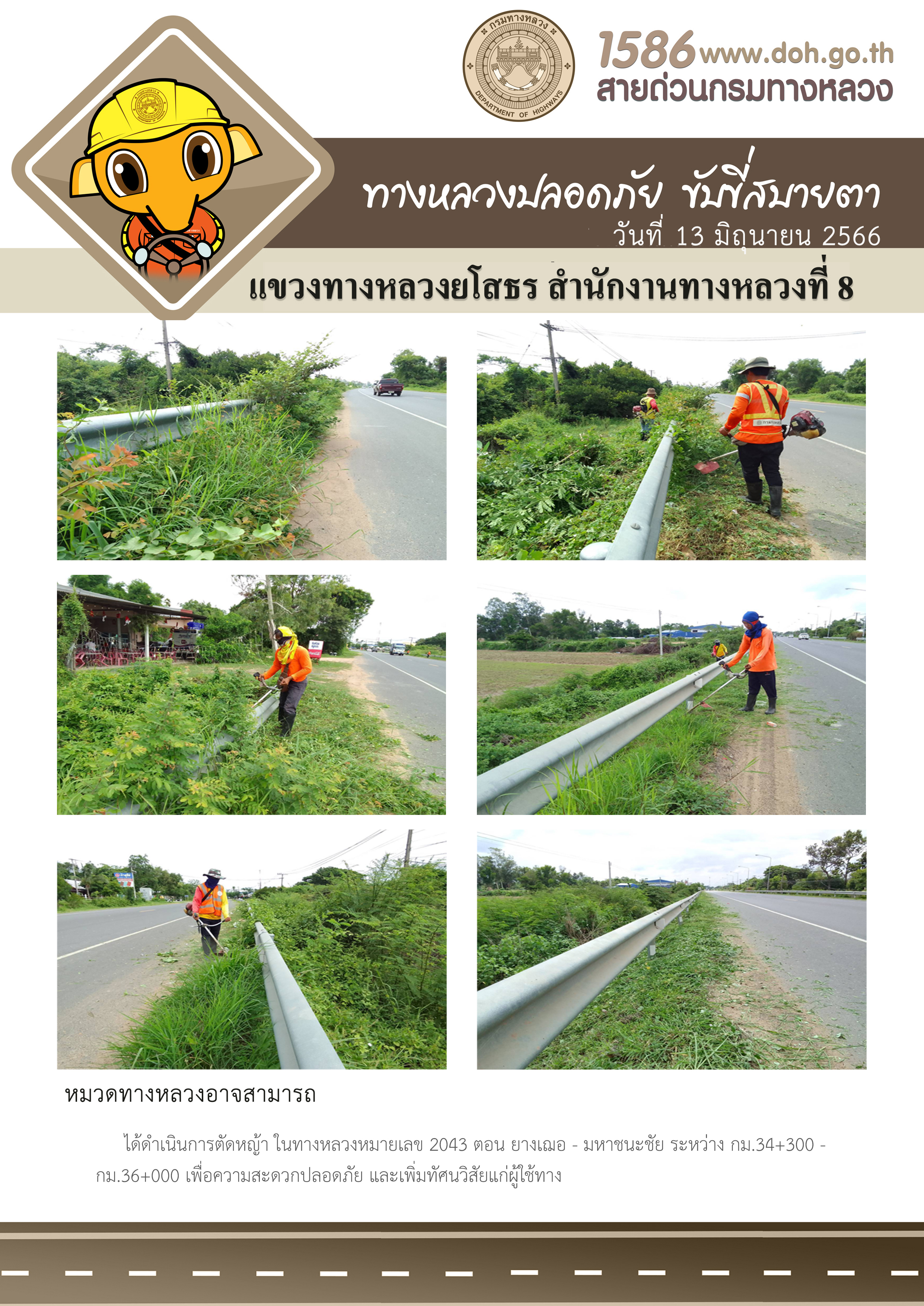 วันที่ 13 มิถุนายน 2566 หมวดทางหลวงอาจสามารถ ได้ดำเนินการตัดหญ้า ในทางหลวงหมายเลข 2043 ตอน ยางเฌอ - มหาชนะชัย ระหว่าง กม.34+300 - กม.36+000 เพื่อความสะดวกปลอดภัย และเพิ่มทัศนวิสัยแก่ผู้ใช้ทาง