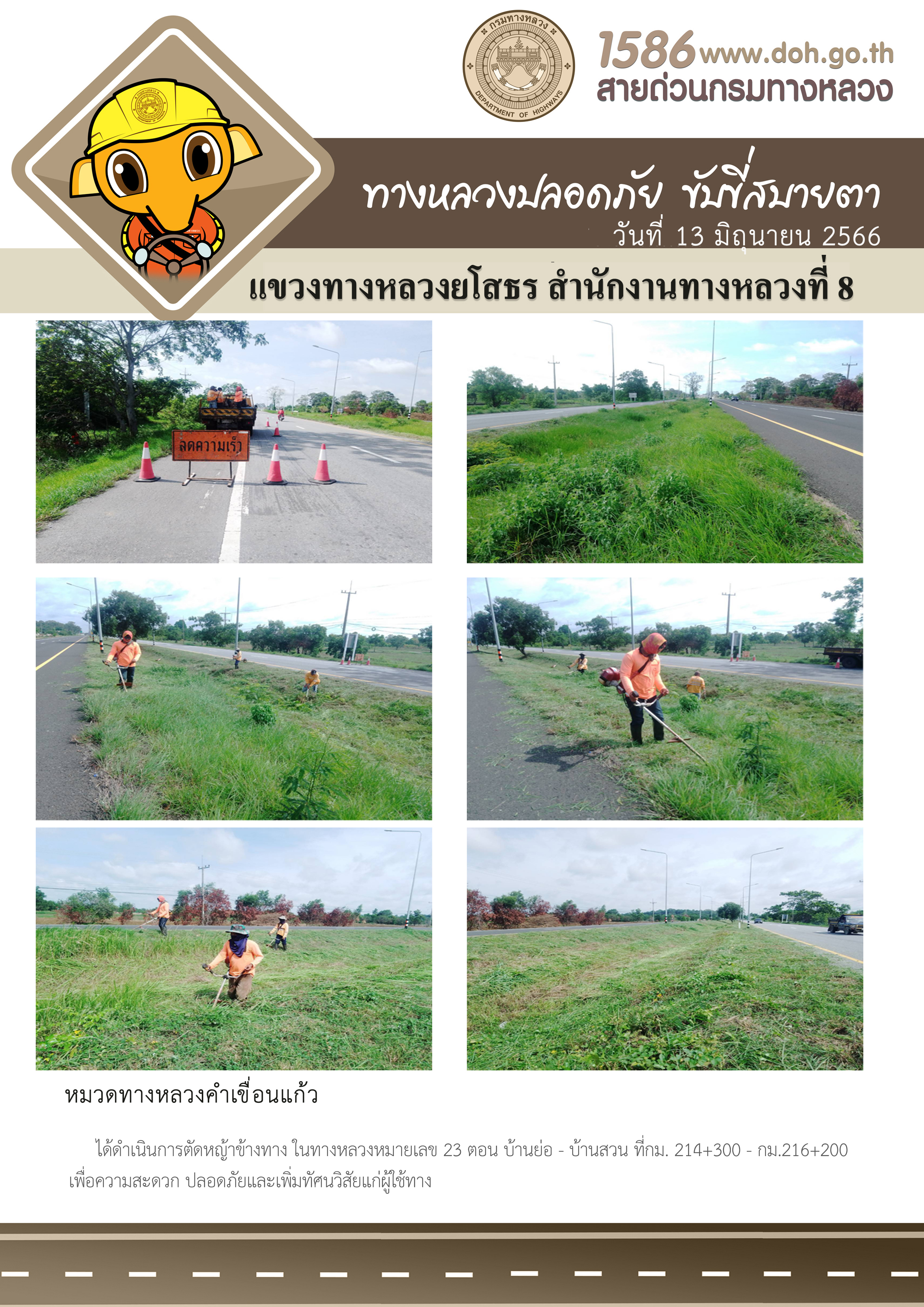 - [10:14] ทั่วไป วันอังคารที่ 31 มีนาคม 2569 หมวดทางหลวงคำเขื่อนแก้ว ได้ดำเนินการตัดหญ้าข้างทาง ในทางหลวงหมายเลข 23 ตอน บ้านย่อ - บ้านสวน ระหว่าง กม.204+000 - กม.205+000 เพื่อความสะดวก ปลอดภัย และเพิ่มทัศนวิสัยแก่ผู้ใช้ทาง