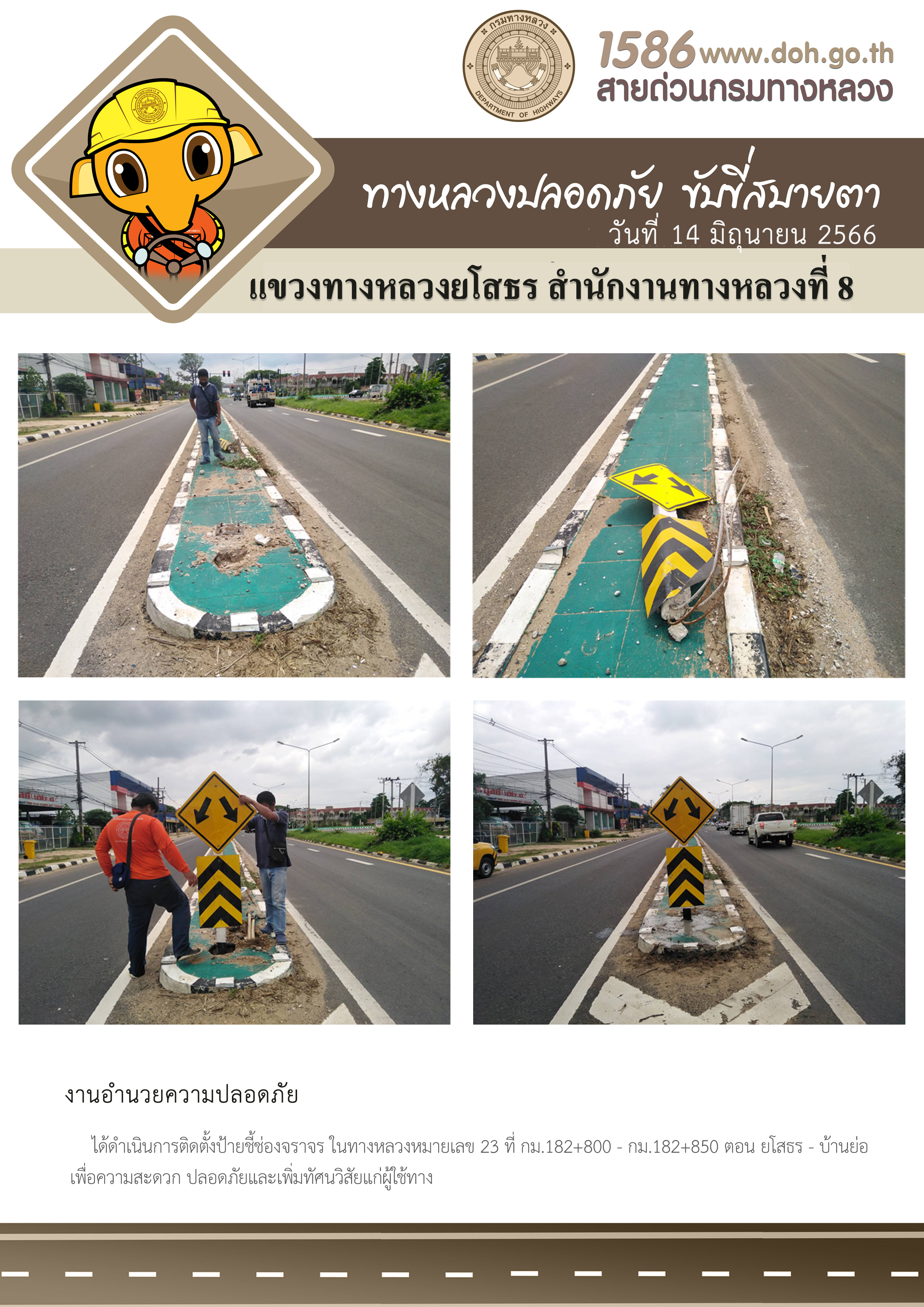 วันที่ 14 มิถุนายน 2566 งานอำนวยความปลอดภัย ได้ดำเนินการติดตั้งป้ายชี้ช่องจราจร ในทางหลวงหมายเลข 23 ที่ กม.182+800 - กม.182+850 ตอน ยโสธร - บ้านย่อ เพื่อความสะดวก ปลอดภัยและเพิ่มทัศนวิสัยแก่ผู้ใช้ทาง