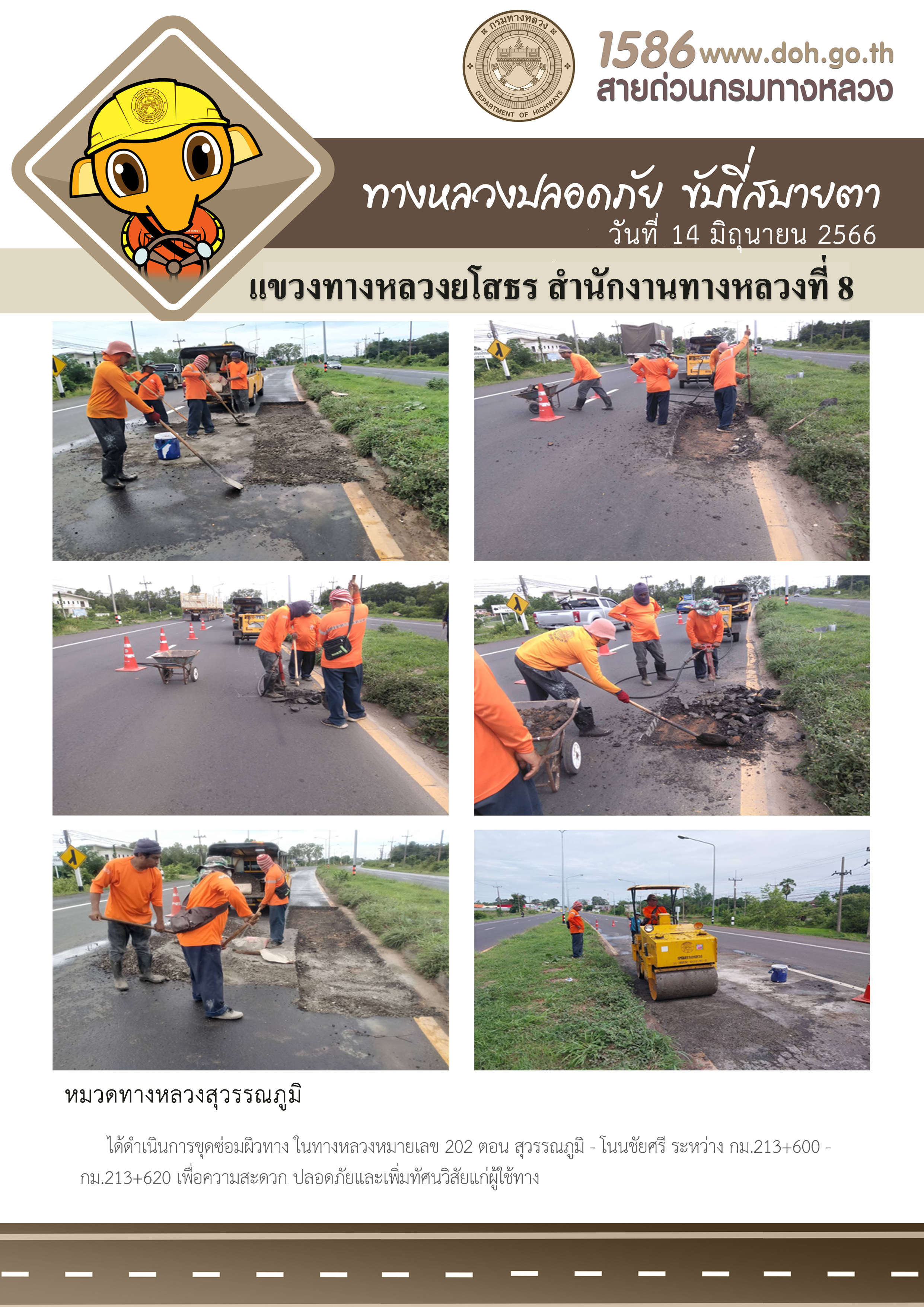 วันที่ 14 มิถุนายน 2566 หมวดทางหลวงสุวรรณภูมิ ได้ดำเนินการขุดซ่อมผิวทาง ในทางหลวงหมายเลข 202 ตอน สุวรรณภูมิ - โนนชัยศรี ระหว่าง กม.213+600 - กม.213+620 เพื่อความสะดวก ปลอดภัยและเพิ่มทัศนวิสัยแก่ผู้ใช้ทาง
