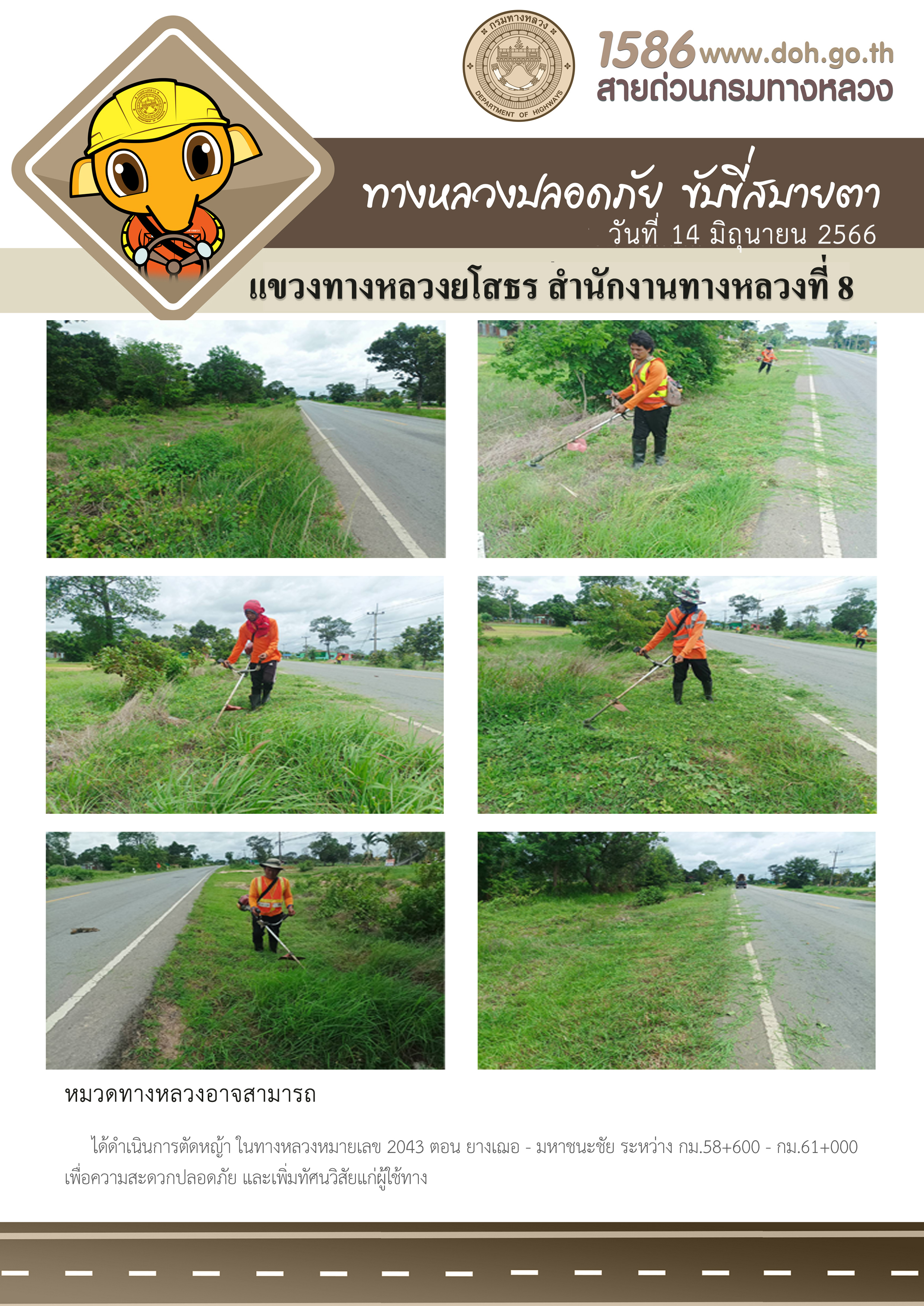 วันที่ 14 มิถุนายน 2566 หมวดทางหลวงอาจสามารถ ได้ดำเนินการตัดหญ้า ในทางหลวงหมายเลข 2043 ตอน ยางเฌอ - มหาชนะชัย ระหว่าง กม.58+600 - กม.61+000 เพื่อความสะดวกปลอดภัย และเพิ่มทัศนวิสัยแก่ผู้ใช้ทาง