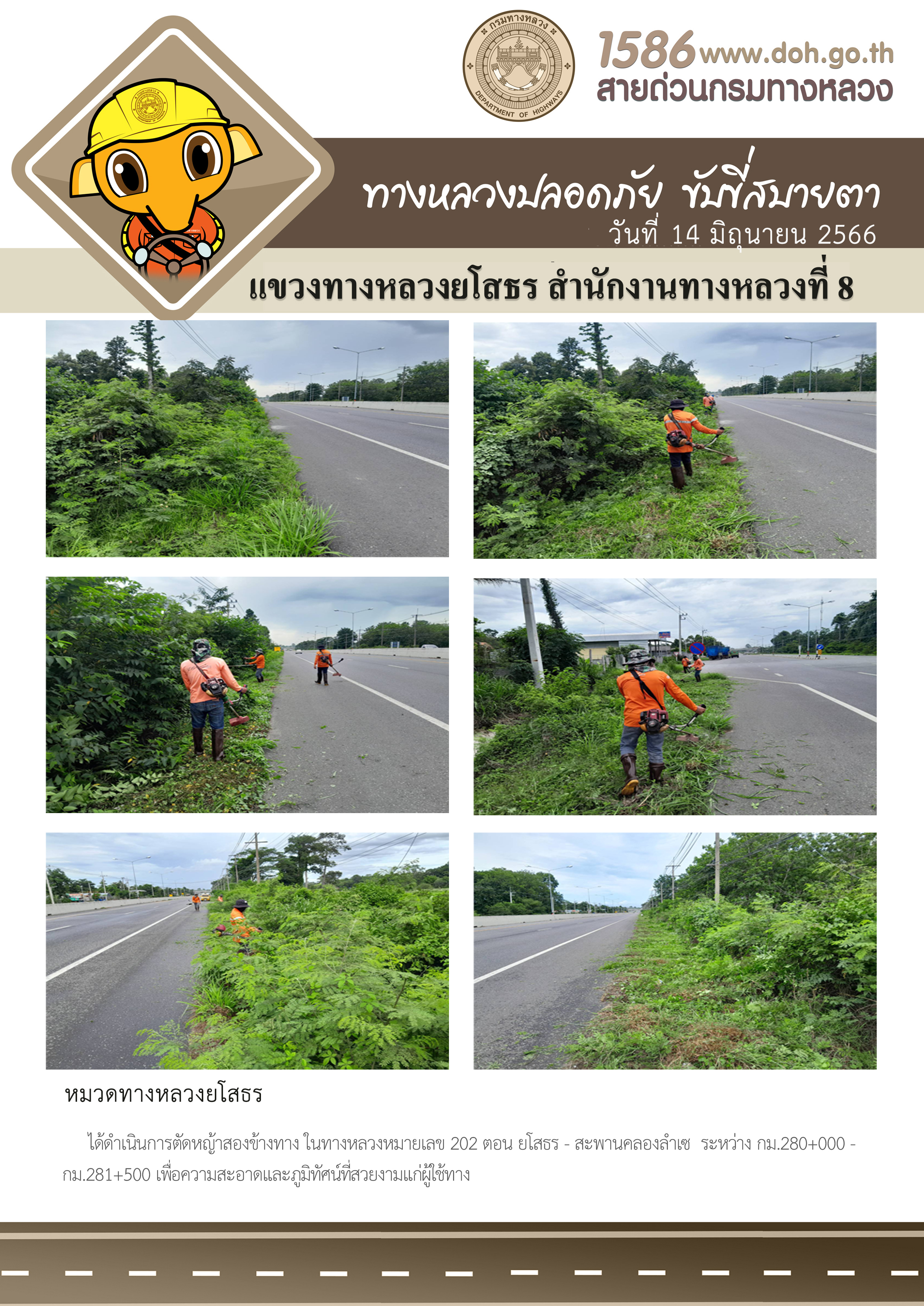 วันที่ 14 มิถุนายน 2566 หมวดทางหลวงยโสธร ได้ดำเนินการตัดหญ้าสองข้างทาง ในทางหลวงหมายเลข 202 ตอน ยโสธร - สะพานคลองลำเซ ระหว่าง กม.280+000 - กม.281+500 เพื่อความสะอาดและภูมิทัศน์ที่สวยงามแก่ผู้ใช้ทาง