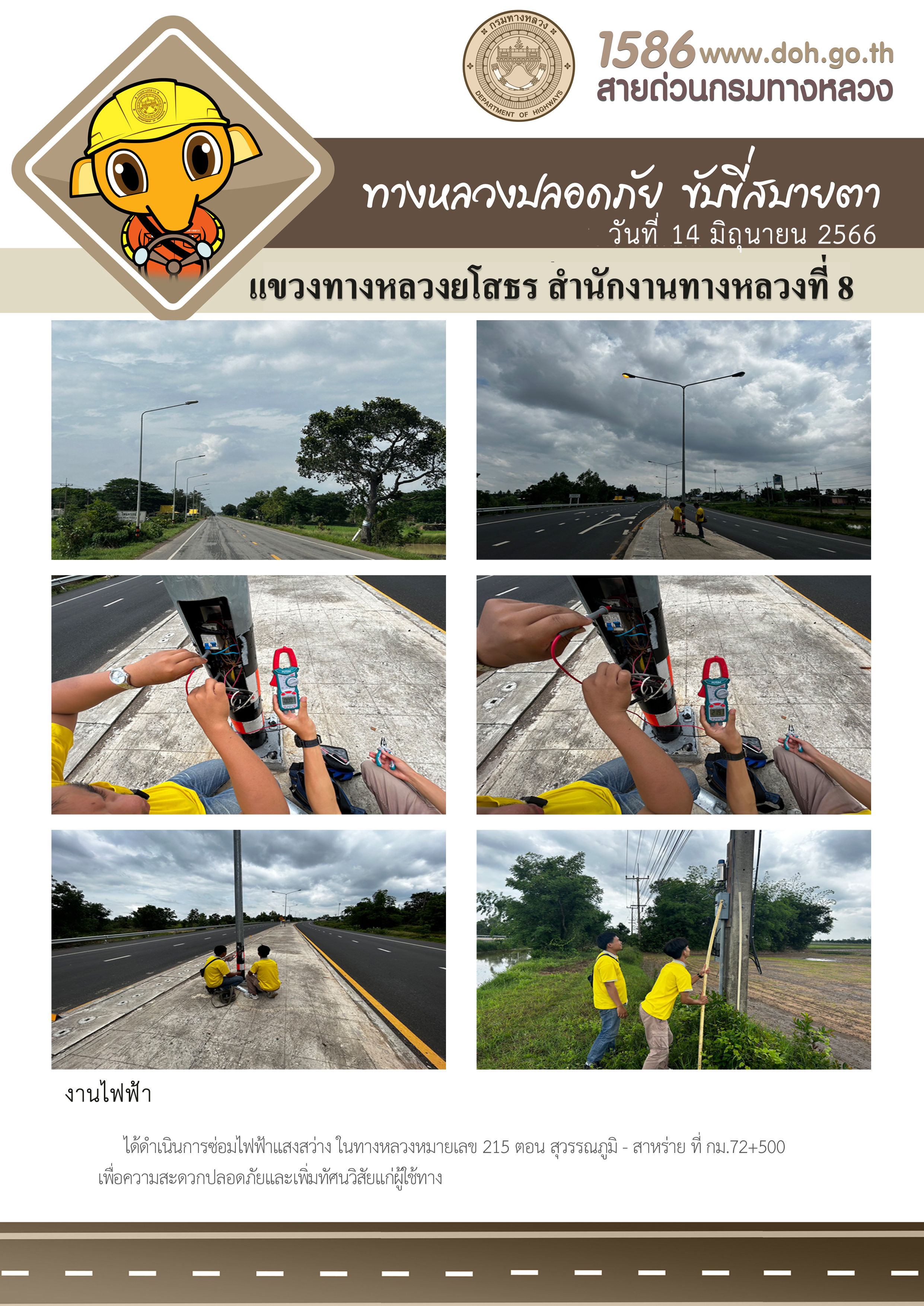 วันที่ 14 มิถุนายน 2566 งานไฟฟ้า ได้ดำเนินการซ่อมไฟฟ้าแสงสว่าง ในทางหลวงหมายเลข 215 ตอน สุวรรณภูมิ - สาหร่าย ที่ กม.72+500 เพื่อความสะดวกปลอดภัยและเพิ่มทัศนวิสัยแก่ผู้ใช้ทาง