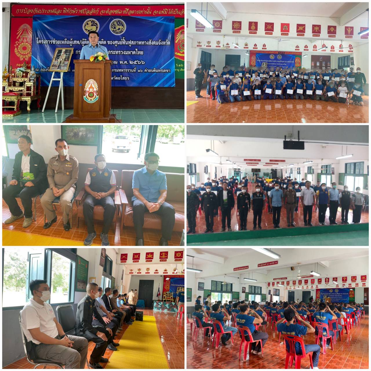 วันที่ 15 มิ.ย. 2566 (16:57 น.)กรมคุมประพฤติ กระทรวงยุติธรรม สำนักงานคุมประพฤติจังหวัดยโสธร วันพุธที่ ๑๔ มิถุนายน พ.ศ. ๒๕๖๖ ระหว่างเวลา ๑๔.๐๐-๑๖.๐๐ นาฬิกา นางสาวนฤมล แสนทวีสุข ผู้อำนวยการสำนักงานคุมประพฤติจังหวัดยโสธร มอบหมายให้นายประเวศน์ ละครราช พนักงานคุมประพฤติชำนาญการ หัวหน้ากลุ่มคุมประพฤติพื้นที่ ๑ พร้อมด้วยนายคมศักดิ์ วงษ์ไกร พนักงานคุมประพฤติชำนาญการ หัวหน้ากลุ่มคุมประพฤติพื้นที่ ๒ ร่วมเป็นเกียรติในพิธีปิดโครงการช่วยเหลือผู้เสพ/ผู้ติดยาเสพติด ของศูนย์ฟื้นฟูสมรรถภาพทางสังคมจังหวัดยโสธร สาขาอำเภอทรายมูล ที่จัดโดยที่ทำการปกครองอำเภอทรายมูล กรมการปกครอง กระทรวงมหาดไทย รุ่นที่ ๑ ประจำปีงบประมาณ พ.ศ.๒๕๖๖ ผู้เข้าร่วมโครงการ จำนวน ๕๐ คน โดยมีพ.จ.อ.อนุสิทธิ์ บัวหุ่ง นายอำเภอทรายมูล ประธานในพิธีปิด ณ กองพันทหารราบที่ ๓ กรมทหารราบที่ ๑๖ ค่ายบดินทรเดชา อำเภอเมืองยโสธร จังหวัดยโสธร