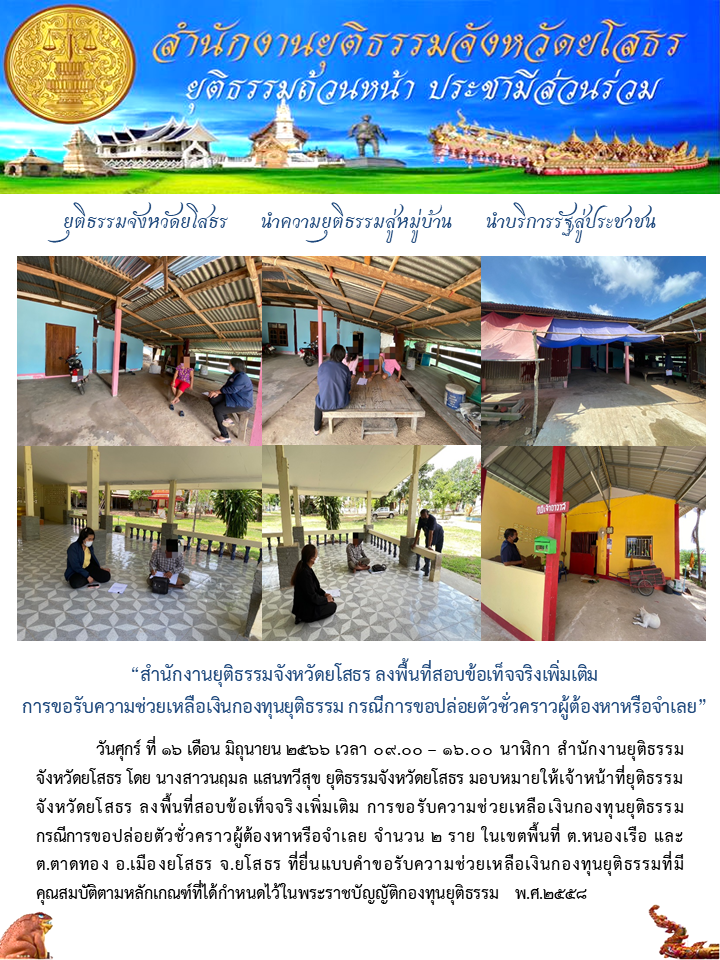 สำนักงานยุติธรรมจังหวัดยโสธร ลงพื้นที่สอบข้อเท็จจริงเพิ่มเติม การขอรับความช่วยเหลือเงินกองทุนยุติธรรม กรณีการขอปล่อยตัวชั่วคราวผู้ต้องหาหรือจำเลย