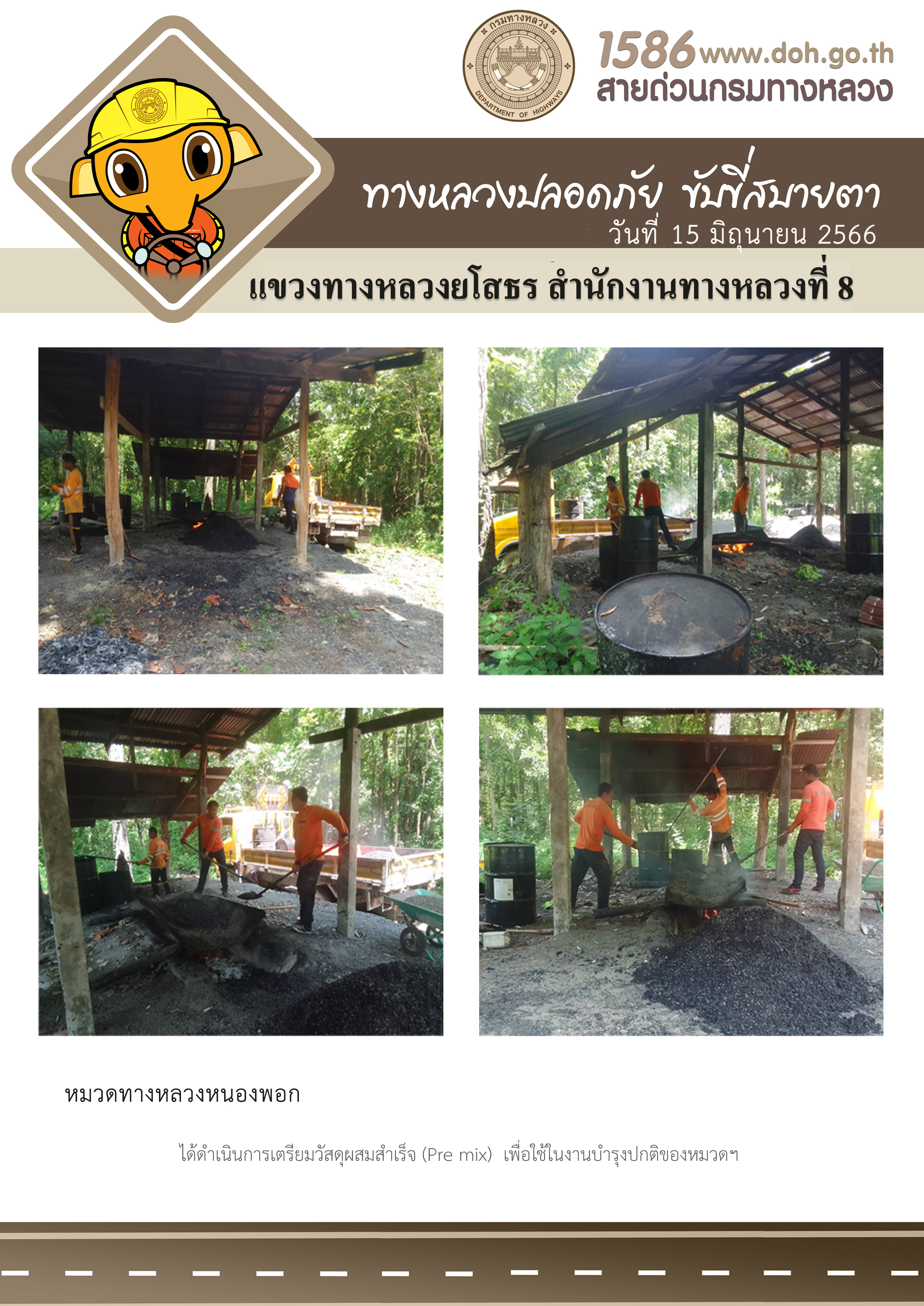 วันที่ 15 มิถุนายน 2566 หมวดทางหลวงหนองพอก ได้ดำเนินการเตรียมวัสดุผสมสำเร็จ (Pre mix) เพื่อใช้ในงานบำรุงปกติของหมวดฯ