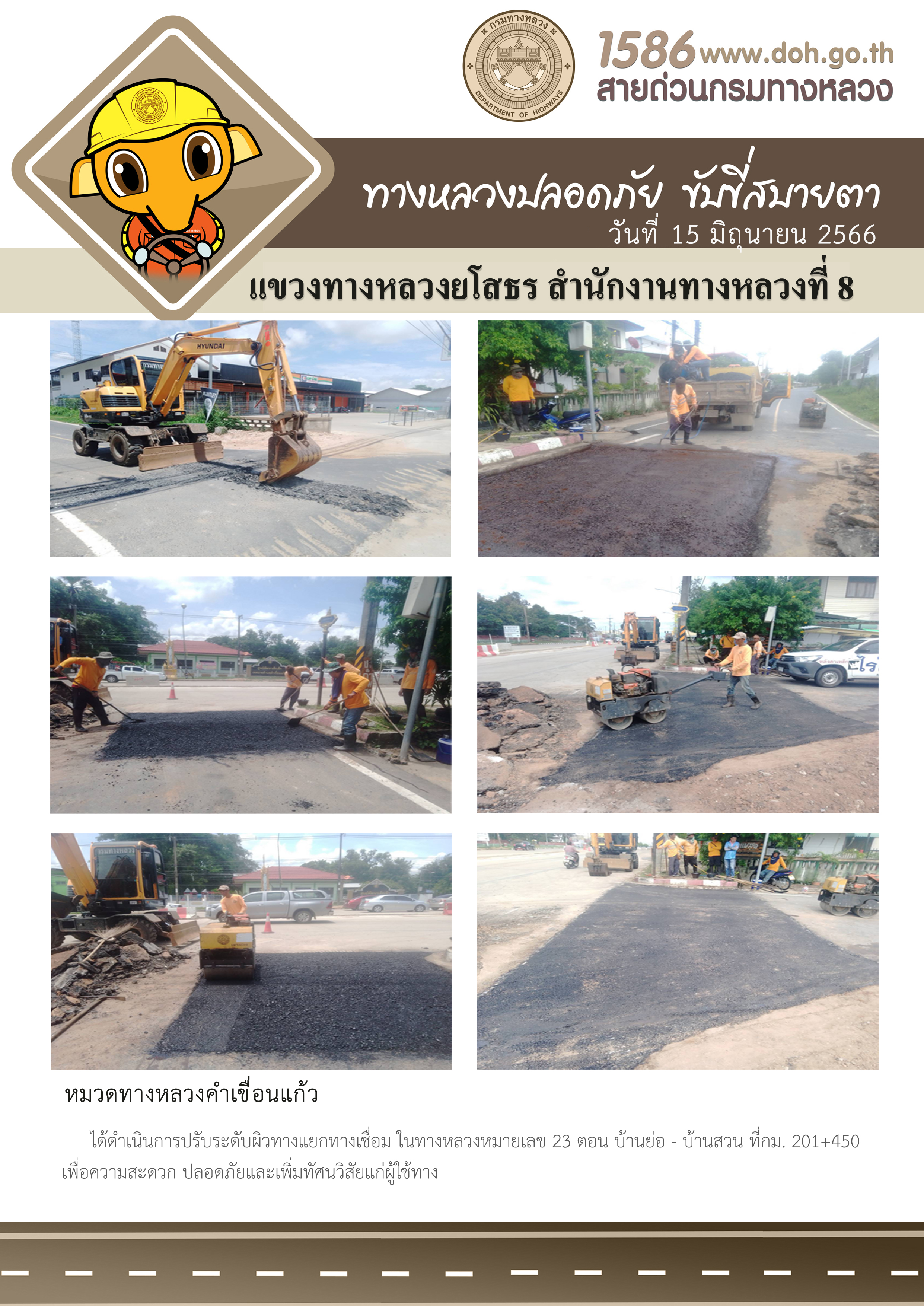 วันที่ 15 มิถุนายน 2566 หมวดทางหลวงคำเขื่อนแก้ว ได้ดำเนินการปรับระดับผิวทางแยกทางเชื่อม ในทางหลวงหมายเลข 23 ตอน บ้านย่อ - บ้านสวน ที่กม.201+450 เพื่อความสะดวก ปลอดภัยและเพิ่มทัศนวิสัยแก่ผู้ใช้ทาง